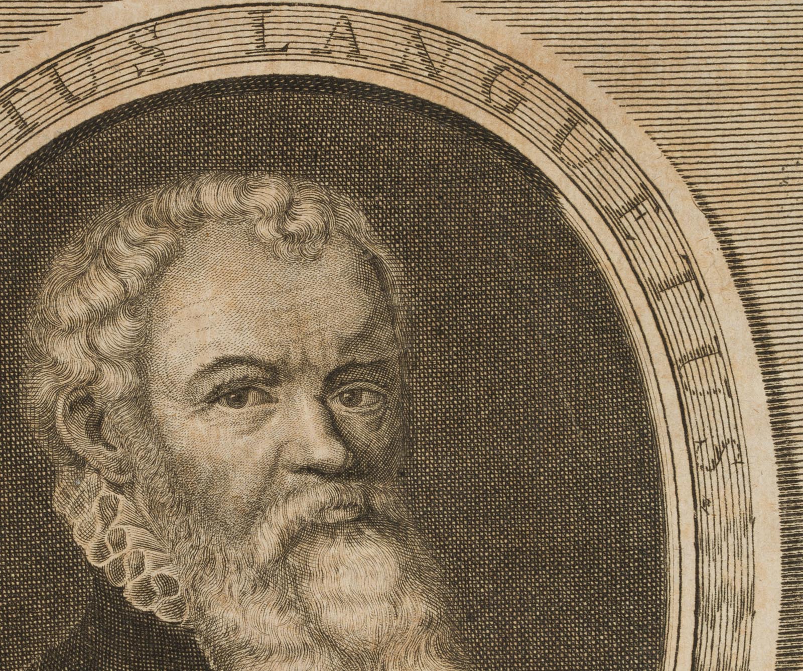 - Inscription: Monogrammed “M. B. Sc.” lower right within the printing plate. Portrait of the French diplomat and jurist Hubert Languet (1518 Vitteaux near Dijon – 1581 Antwerp) in an oval. The sitter is depicted in a black doublet and with a ruff, below in front of the base with a coat of arms flanked by two leopards. Languet studied in Padua and Bologna and travelled to Italy and Spain; from 1559 on Melanchthon’s recommendation he was a diplomat in the service of the Elector of Saxony; from 1573-1576 he lived at the court of the Emperor Maximilian II, whom he accompanied on his travels. (Lit.Nagl. Mon. IV, 1671.).