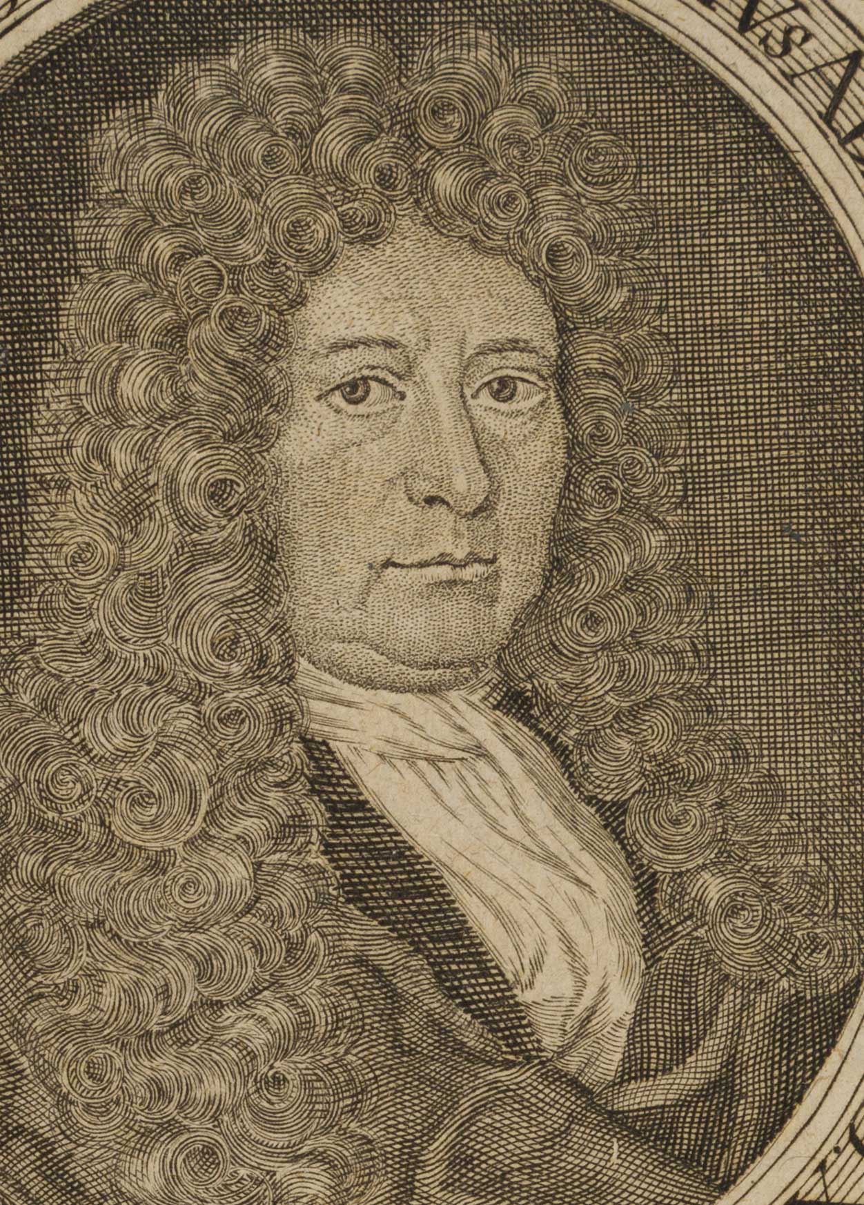 Martin Bernigeroth (1670 Rammelburg – 1733 Leipzig) zugeschrieben, Bildnis des deutschen Juristen Georg Adam Struve (1619 Magdeburg – 1692 Jena), Professor für Rechtswissenschaften, Bruststück im Schriftoval als Dreiviertelportrait nach rechts mit Halstuch und Allongeperücke, 18. Jahrhundert, Kupferstich