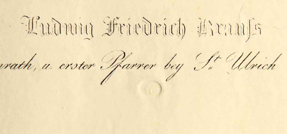 - Bezeichnung: Unterhalb der Darstellung im Stein vom Künstler signiert. Darunter auf dem Trägerblatt zusätzlich mit dem Namen und den Ämtern des Dargestellten bezeichnet und mit einem Prägestempel mit dem Monogramm “F.E.” versehen.