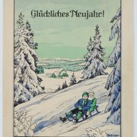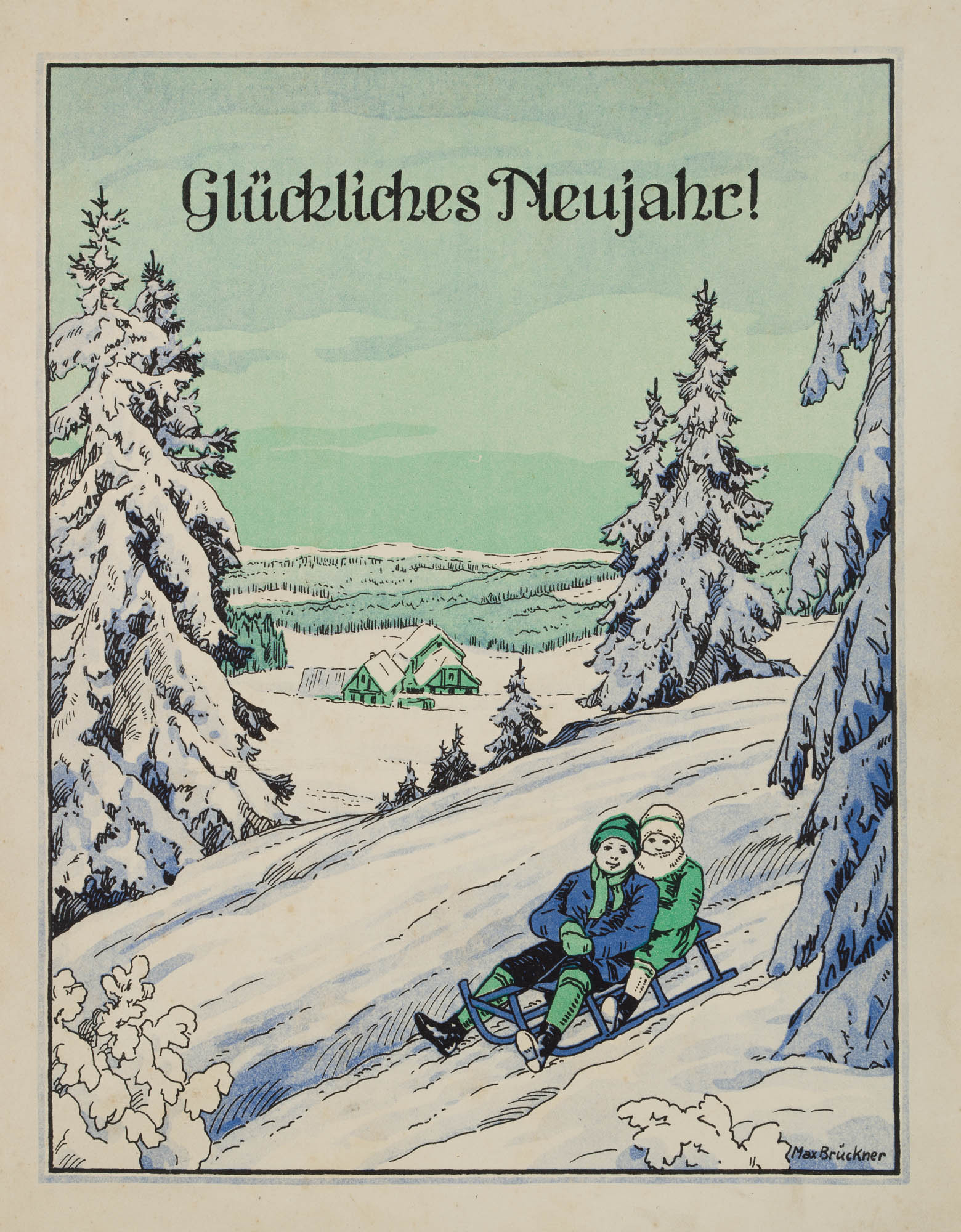 Max Brückner (1836 – 1919 ), Neujahrsbrief, “Glückliches Neujahr!”, Die Schlittenfahrt, Darstellung von Max BRÜCKNER (1836-1919, deutscher Theatermaler), um 1930, Chromolithographie