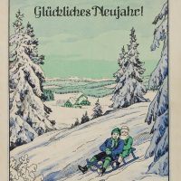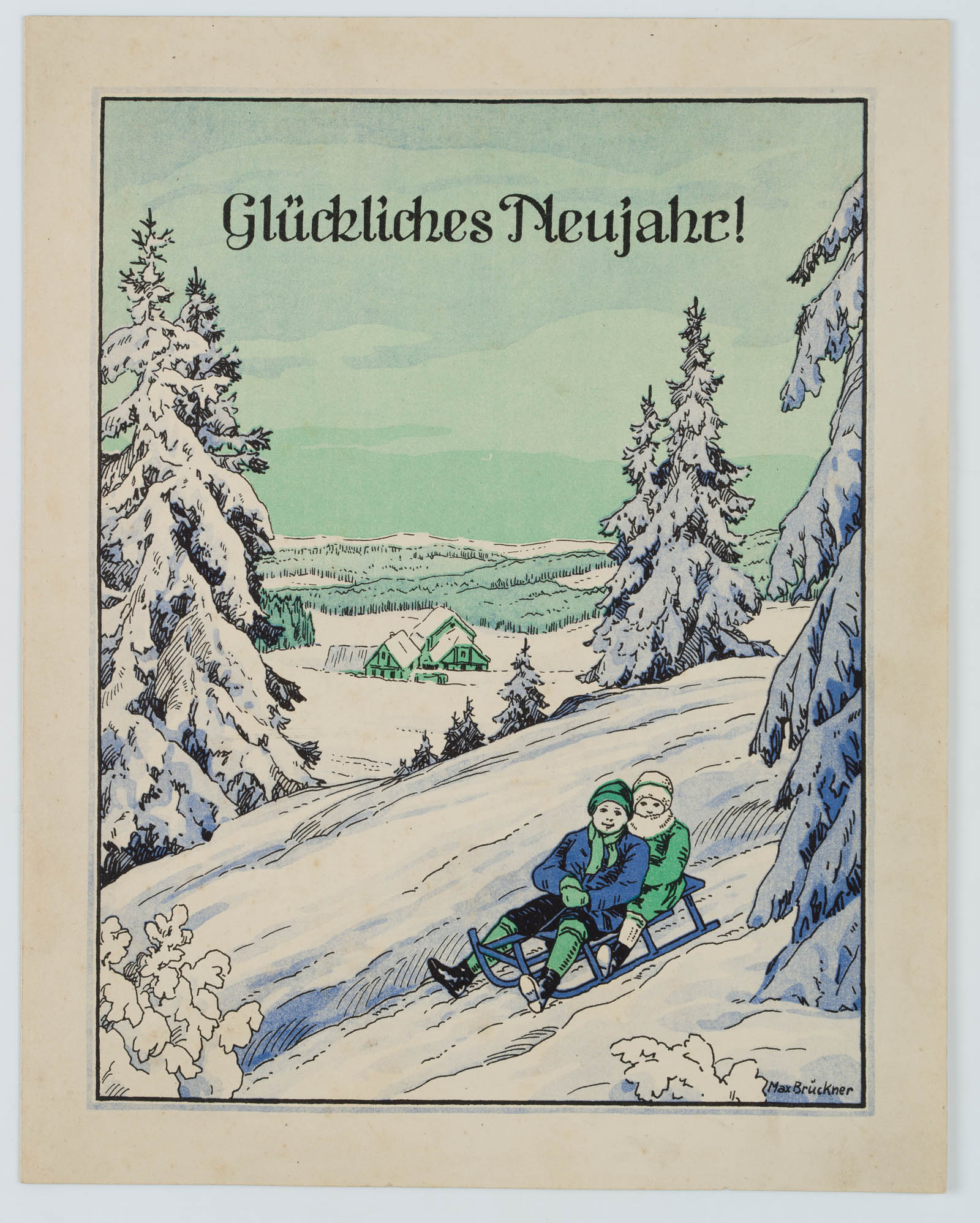 Max Brückner (1836 – 1919 ), New Year’s Letter, “Happy New Year!”, The Sleigh Ride, depiction by Max BRÜCKNER (1836-1919, German theatre painter), c. 1930, Chromolithograph