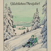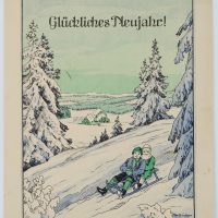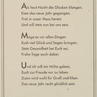 - Beschreibung: Innen mit drei Strophen, vorgedruckt: “Als heut Nacht die Glocken klangen, Kam das neue Jahr gegangen.Dann wird wohl für Groß und Klein / das neue Jahr recht glücklich sein.”. Auf der Vorderseite unten rechts signiert “Max Brückner”, unten links datiert: 1930.