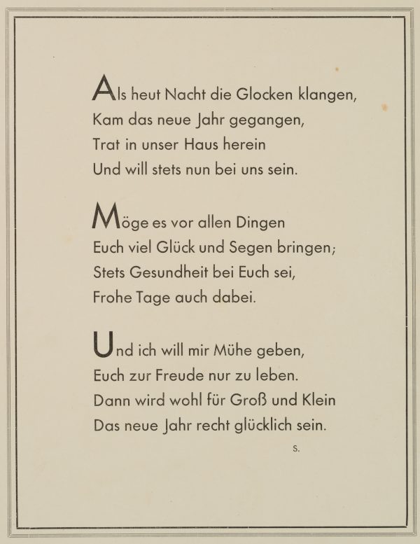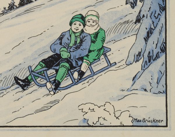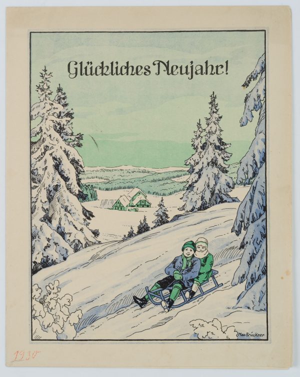 - Description: Inside with three verses, pre-printed: “When tonight the bells rang, Kam das neue Jahr gegangen.dann wird wohl für Groß und Klein / das neue Jahr recht glücklich sein.”. Signed on the front bottom right “Max Brückner”, dated bottom left: 1930.