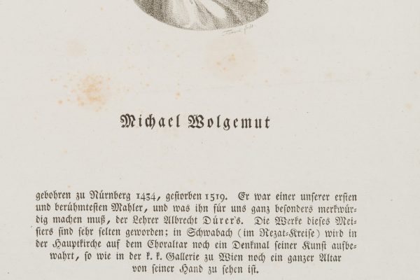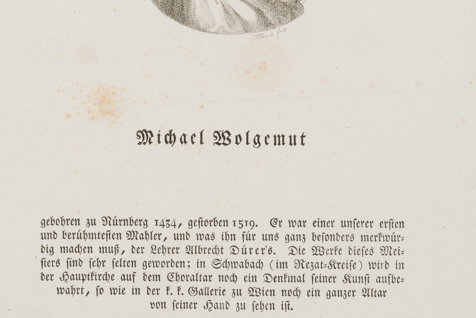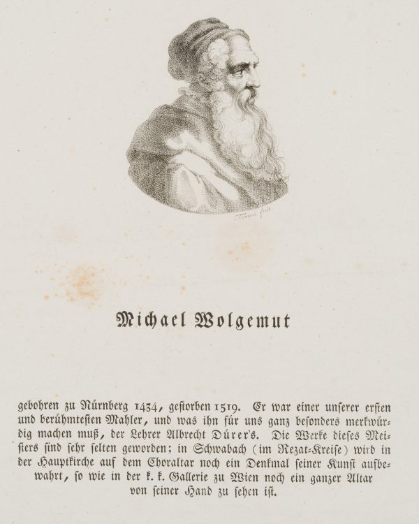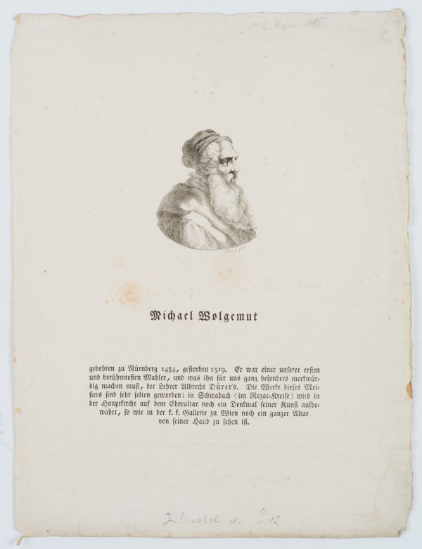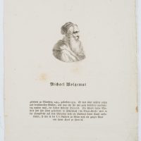 - Schlagworte: Portrait, Bildnis, Bruststück, Profilportrait, Künstlerportrait, Michael Wolgemut, Albrecht Dürer, Meister des Holzschnitts, Inkunabel, Wiegendruck, Porträt, Politik, Deutschland, Realismus, 1800-1849