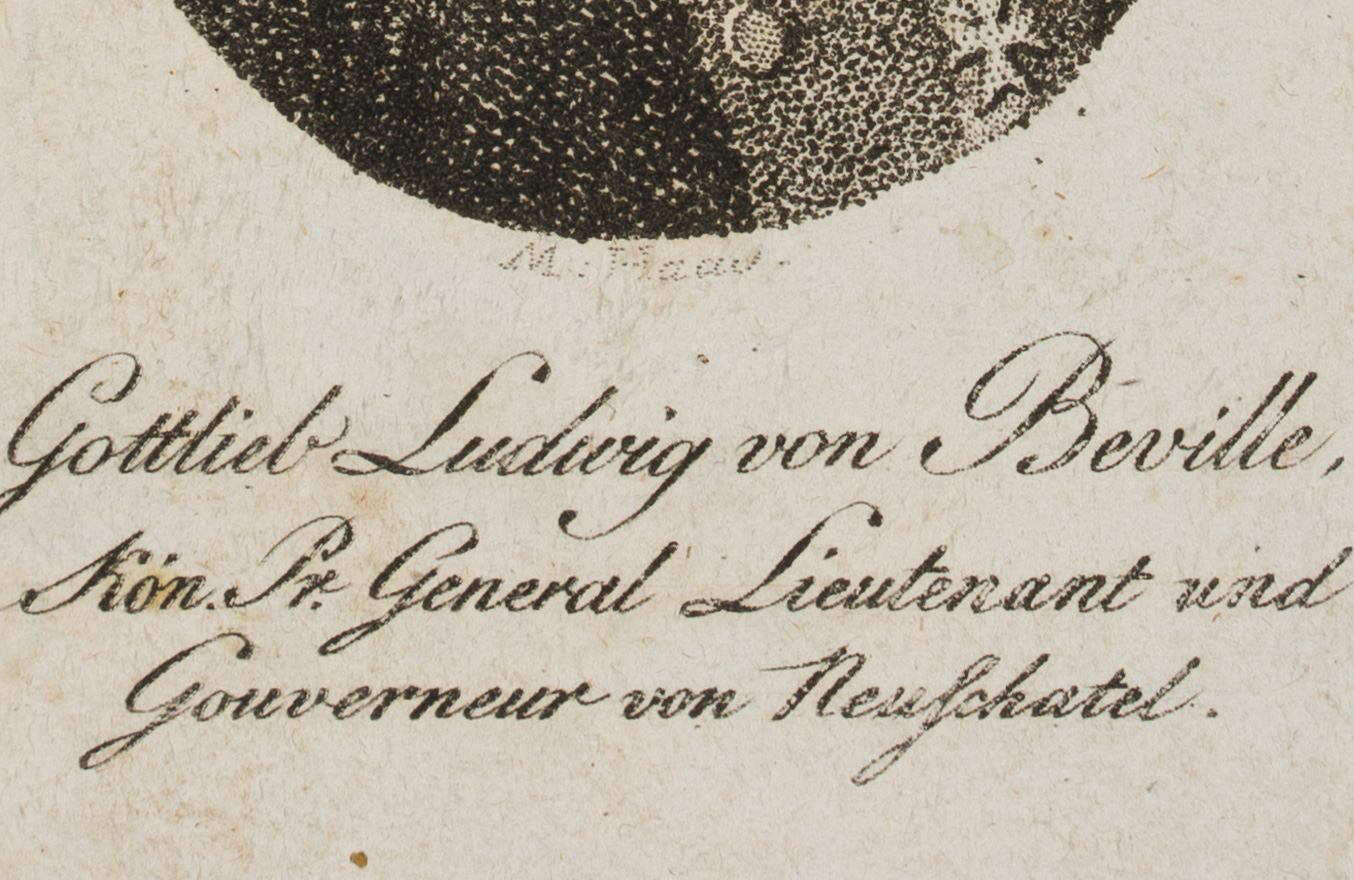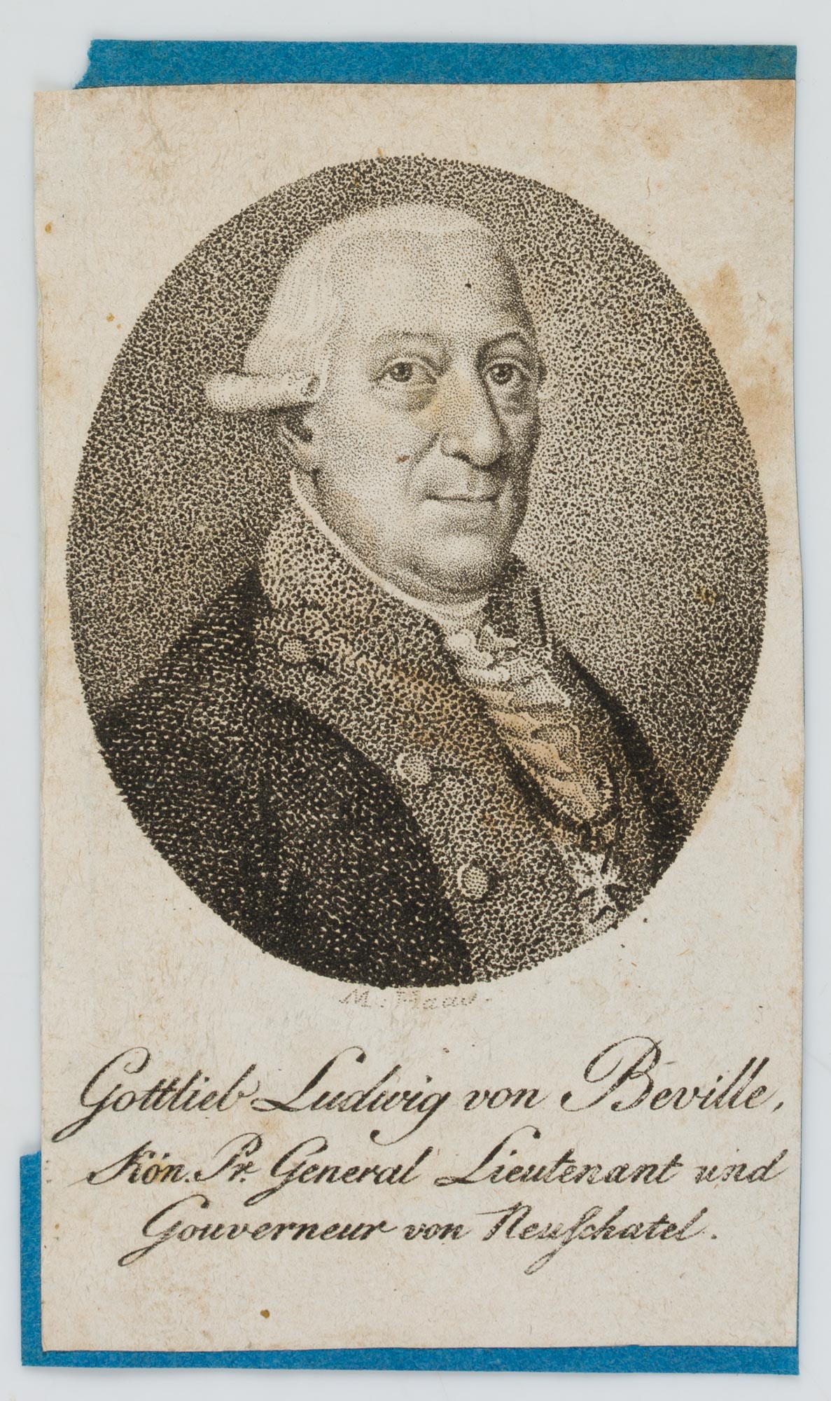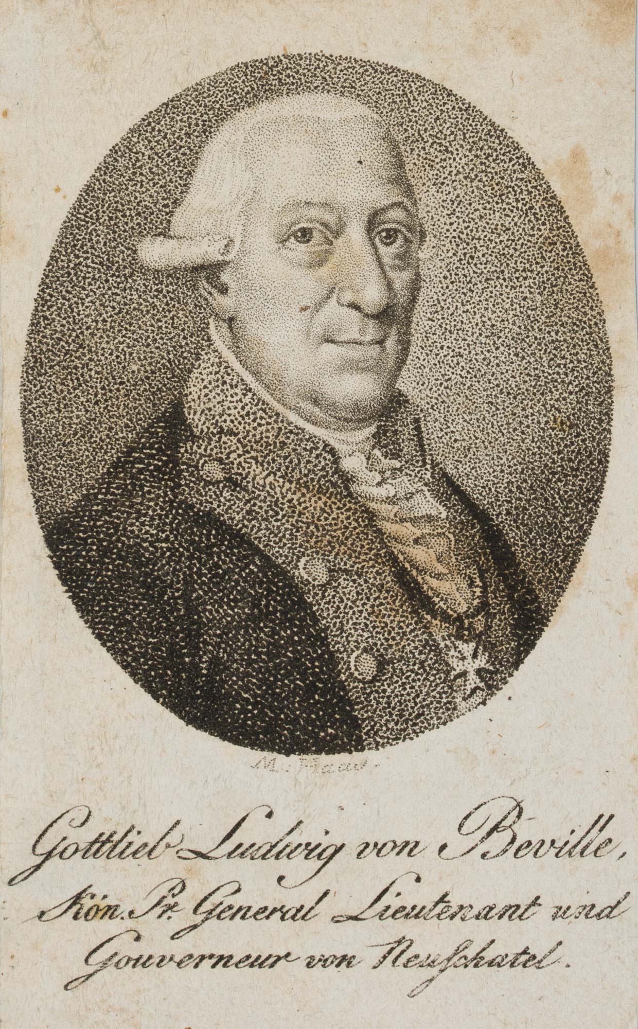 Unter der Darstellung signiert, darunter betitelt “Gottlieb Ludwig von Beville Könl. General Lieutnant und Gouverneur…”.