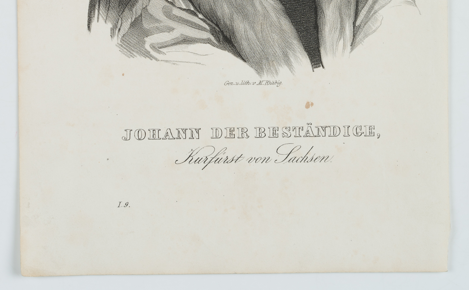 - Beschreibung: Mittig unterhalb der Darstellung signiert, darunter mit dem Namen des Dargestellten und dessen Titel beschriftet. Das Blatt trägt unten links die Nummerierung “I.9”.