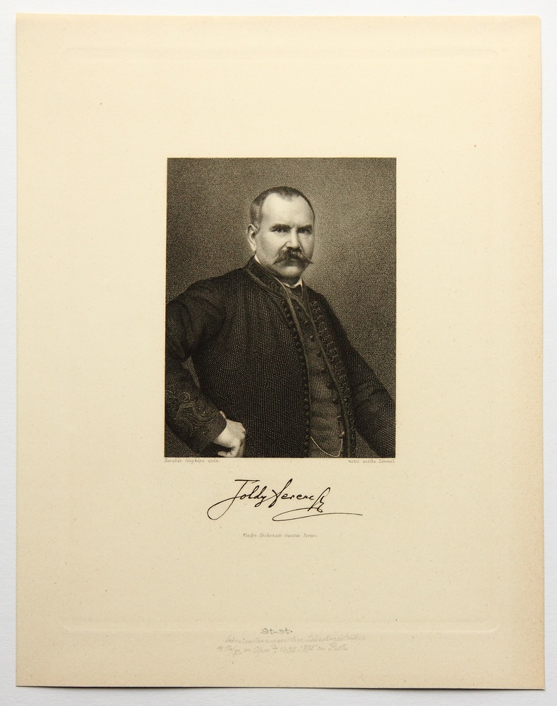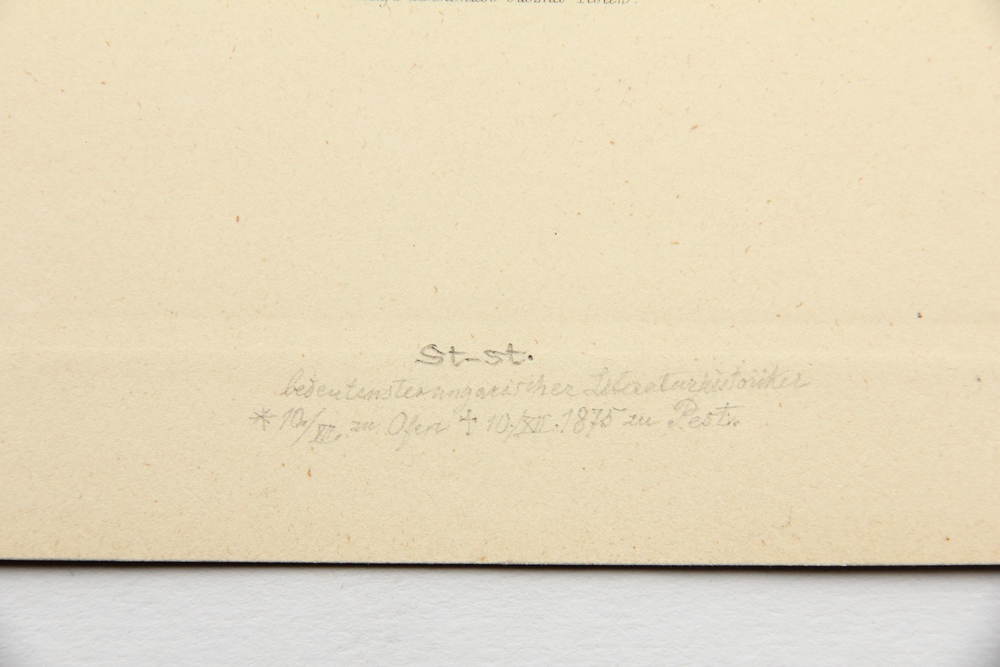 - Bezeichnung: Unterhalb der Darstellung in der Druckplatte signiert sowie mit der eigenhändigen(?) Unterschrift des Dargestellten bezeichnet. Am unteren Blattrand befindet sich eine Bezeichnung mit den Lebensdaten des Dargestellten in Bleistift.