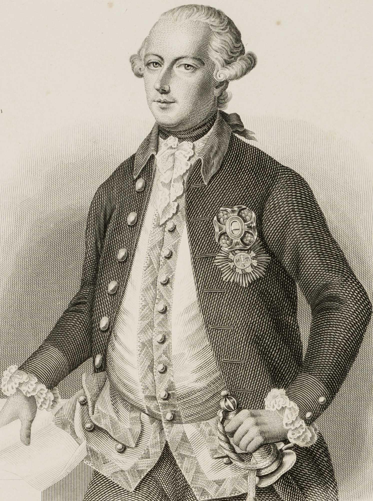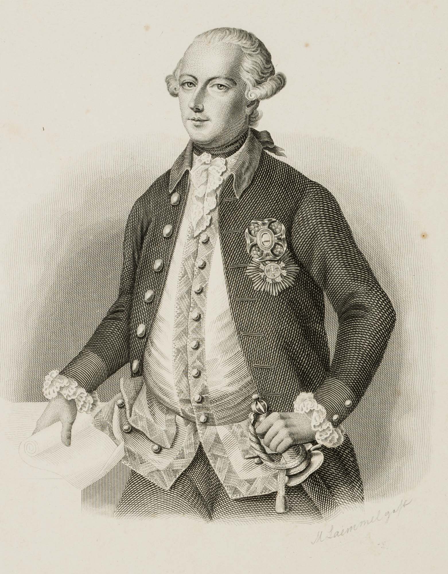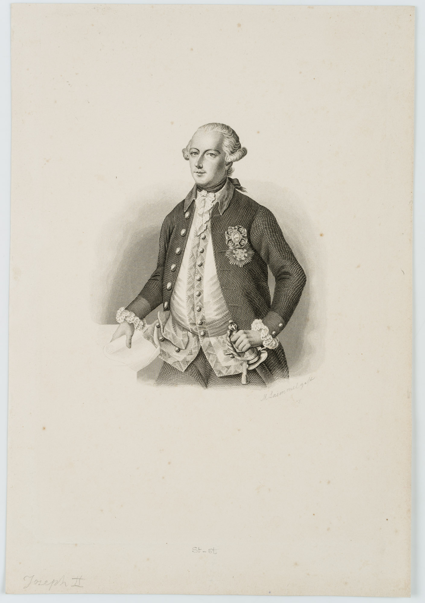 Martin Moritz Lämmel (*1849 Kulkwitz), Porträt des Joseph II. (1741, Wien – 1790, ebenda) Kaiser des Heiligen Römischen Reiches mit Degen und Bruststernen, 19. Jahrhundert, Stahlstich