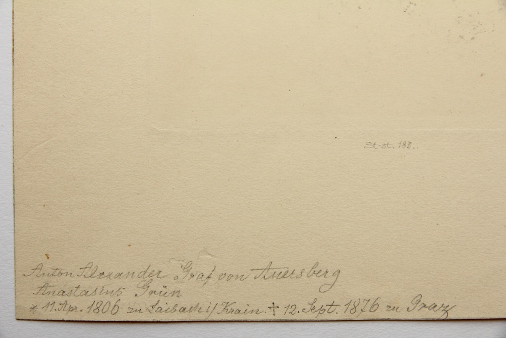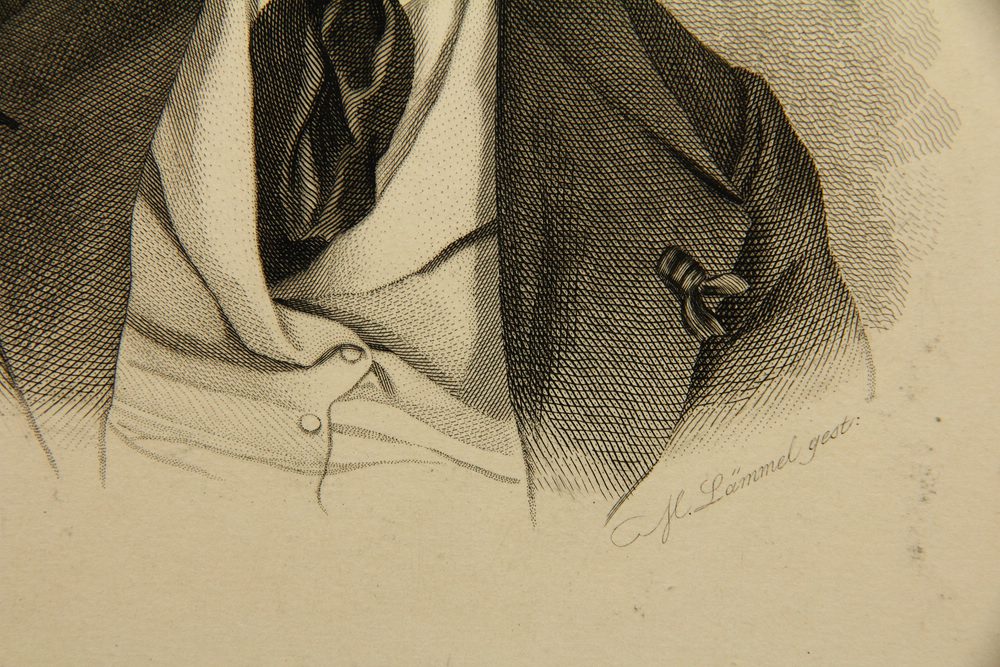- Bezeichnung: Unterhalb der Darstellung in der Druckplatte signiert. Am unteren Blattrand befindet sich eine Bezeichnung mit den Lebensdaten des Dargestellten in Bleistift.
