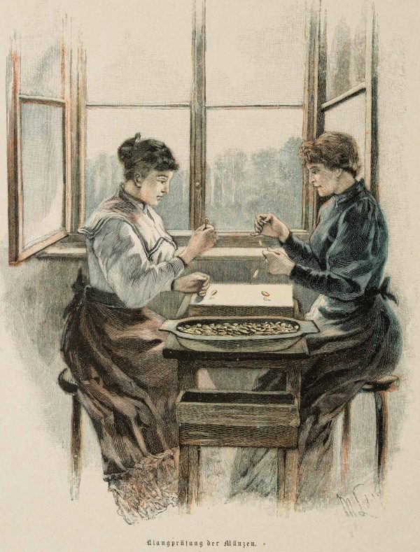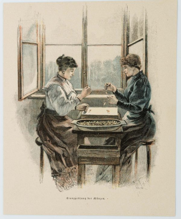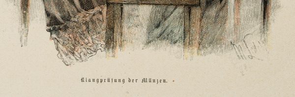 - Description: Inscribed under the engraving: “Klangprüfung der Münzen.