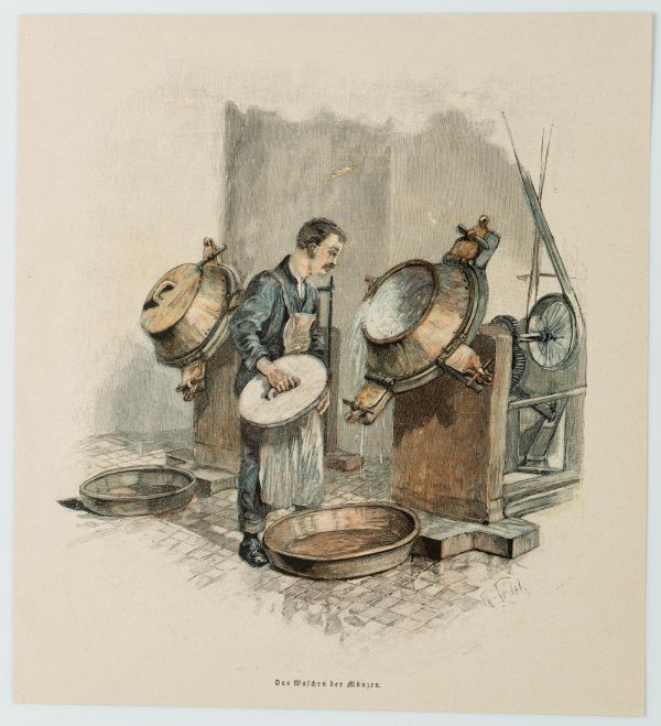 Moritz Ledeli (1856 – 1920 ), Das Waschen der Münzen, Genreszene zum Arbeitsalltag in einer Münzstätte, 19. Jahrhundert, Holzstich