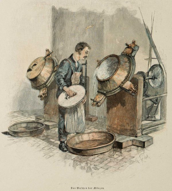Moritz Ledeli (1856 – 1920 ), The washing of the coins, genre scene about the everyday work in a mint, 19th century, Wood engraving