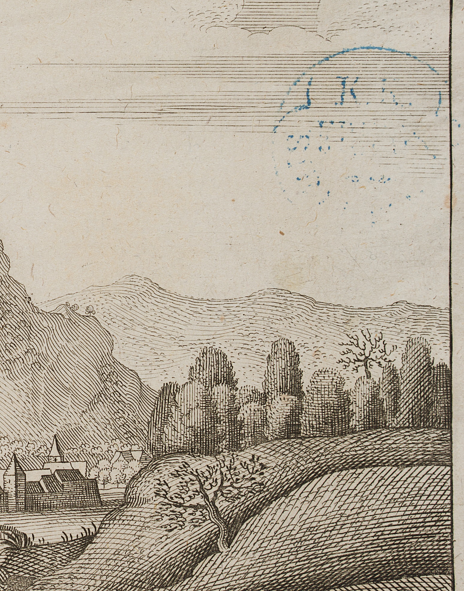 - Condition: Very good condition. Pale foxing. The upper left corner of the sheet is somewhat thinned and damaged. Along the edges remains of adhesive tape from an old mounting. Minimal light margins. Faded collector’s stamp in the image on the right.