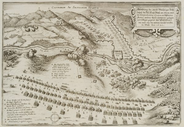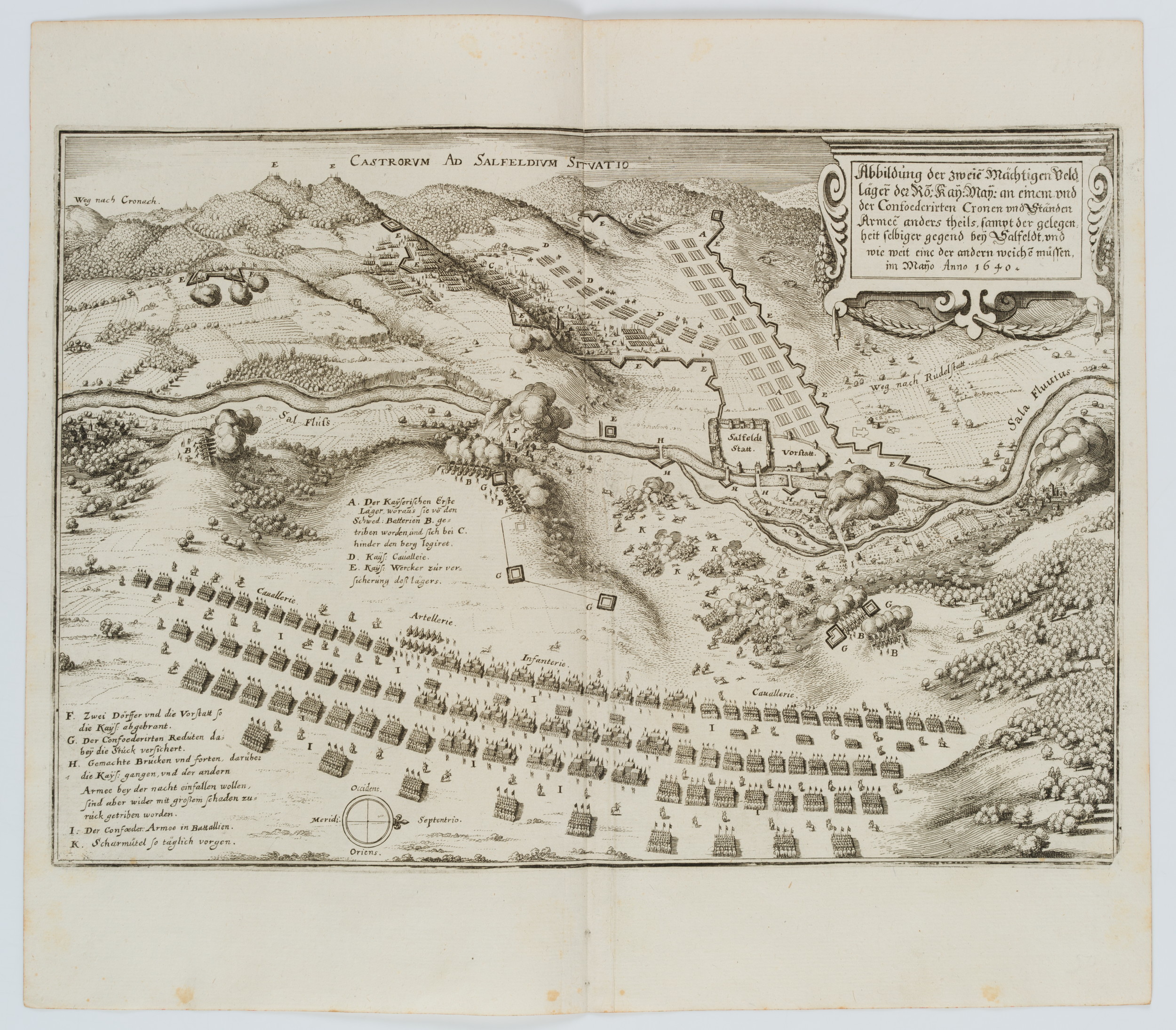- Bezeichnung: Oben mittig im Druck bezeichnet: “Castrorum Ad Salfeldium Sitvatio”. Oben rechts weitere Beschriftungen: “Abbildung der zweie Mächtigen Feldlager der Röm: Kay: an einem und der Confoederirten Cronen und Ständen Armee anders theils, sampt der gelegenheit selbiger gegen bey Salfeldt, und wie weit eine der andern weiche müssen. im May Anno 1640.”.