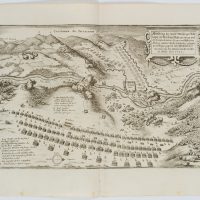 - Description: Strategic battle plan showing the deployment of the Emperor’s troops. Top right with text cartouche. Bottom left with legends to the troop units indicated by letters.