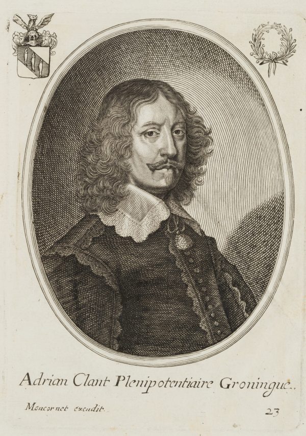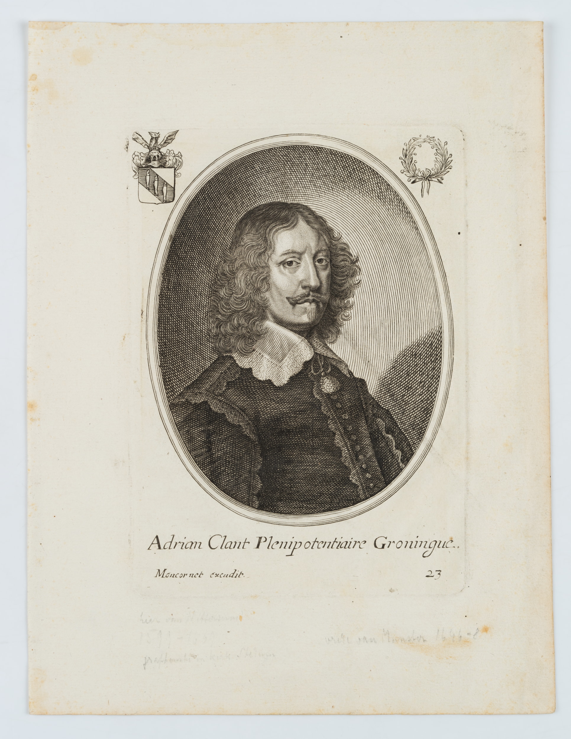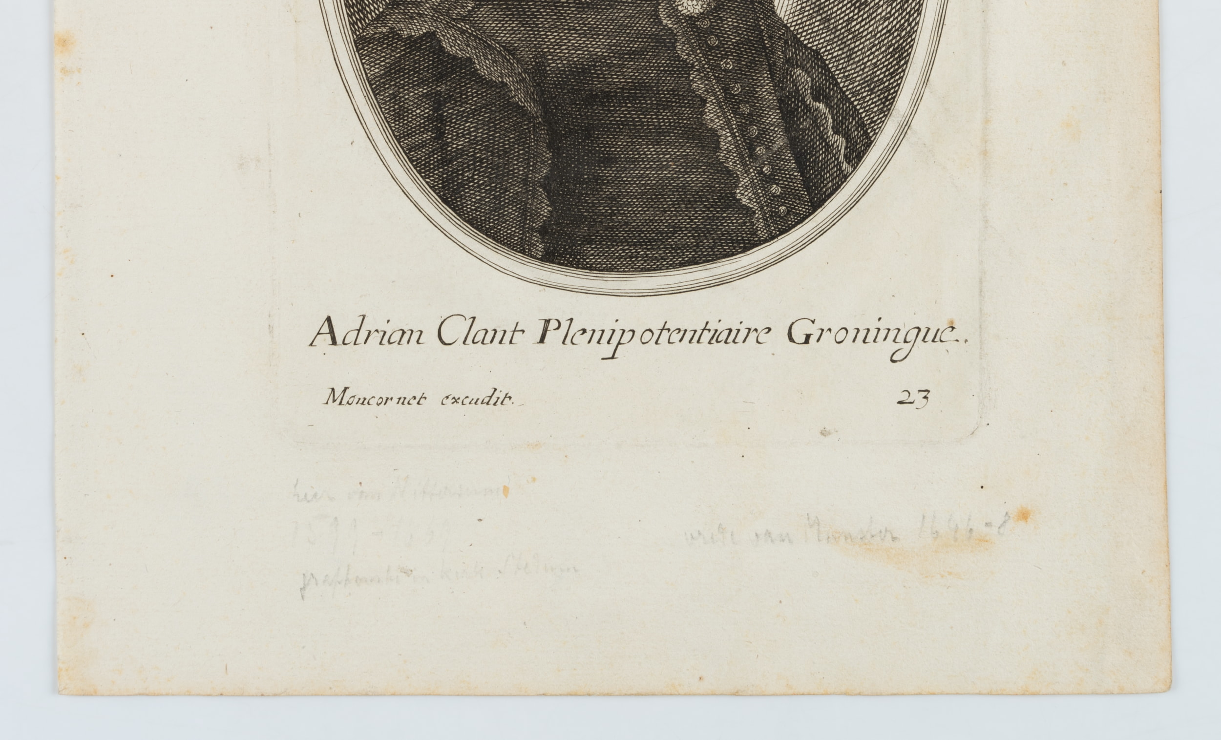 - Inscription: Lower middle inscribed in the printing plate: “Adrian Clant Plenipotentiaire Groningue […]”. Lower right numbered in the printing plate: “23”.