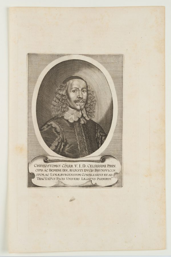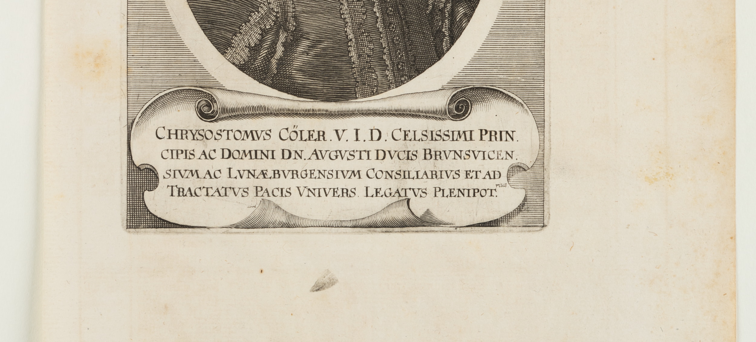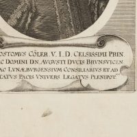 - Inscription: Lower middle inscribed in the printing plate: “CHRYSOSTOMUS CÖLER. V. I. D. CELSISSIMI PRIN. CIPIS AC DOMINI DN. AUGUSTI DUCIS BRUNSVICEN. […]”.