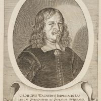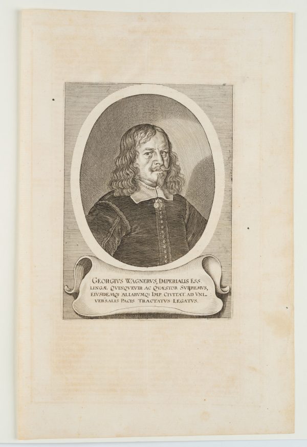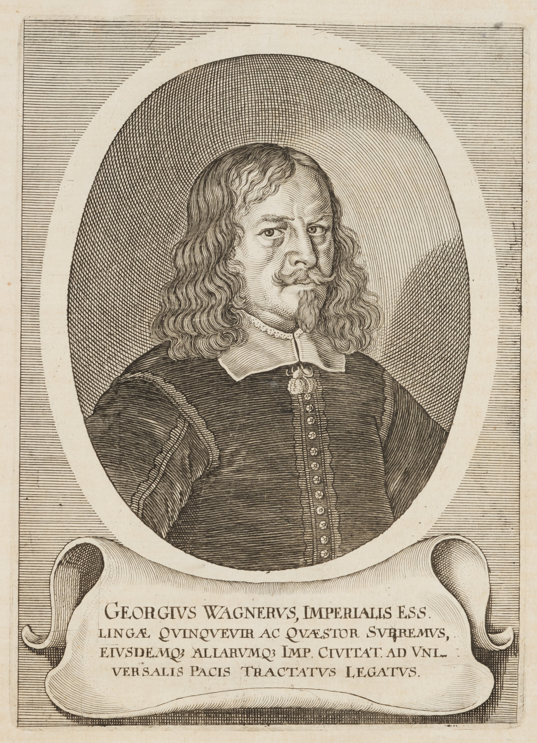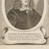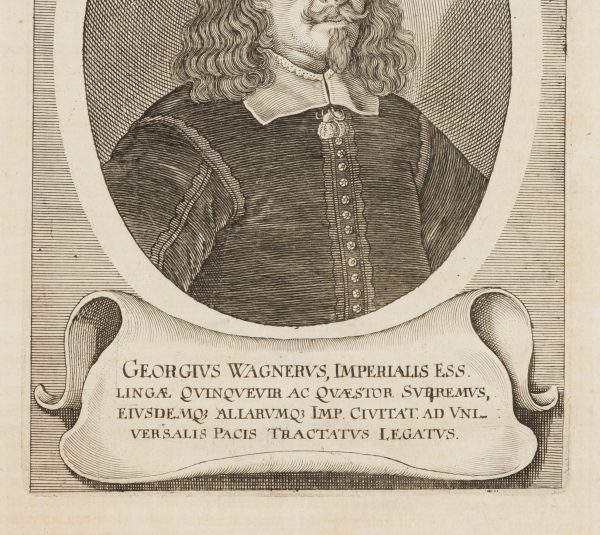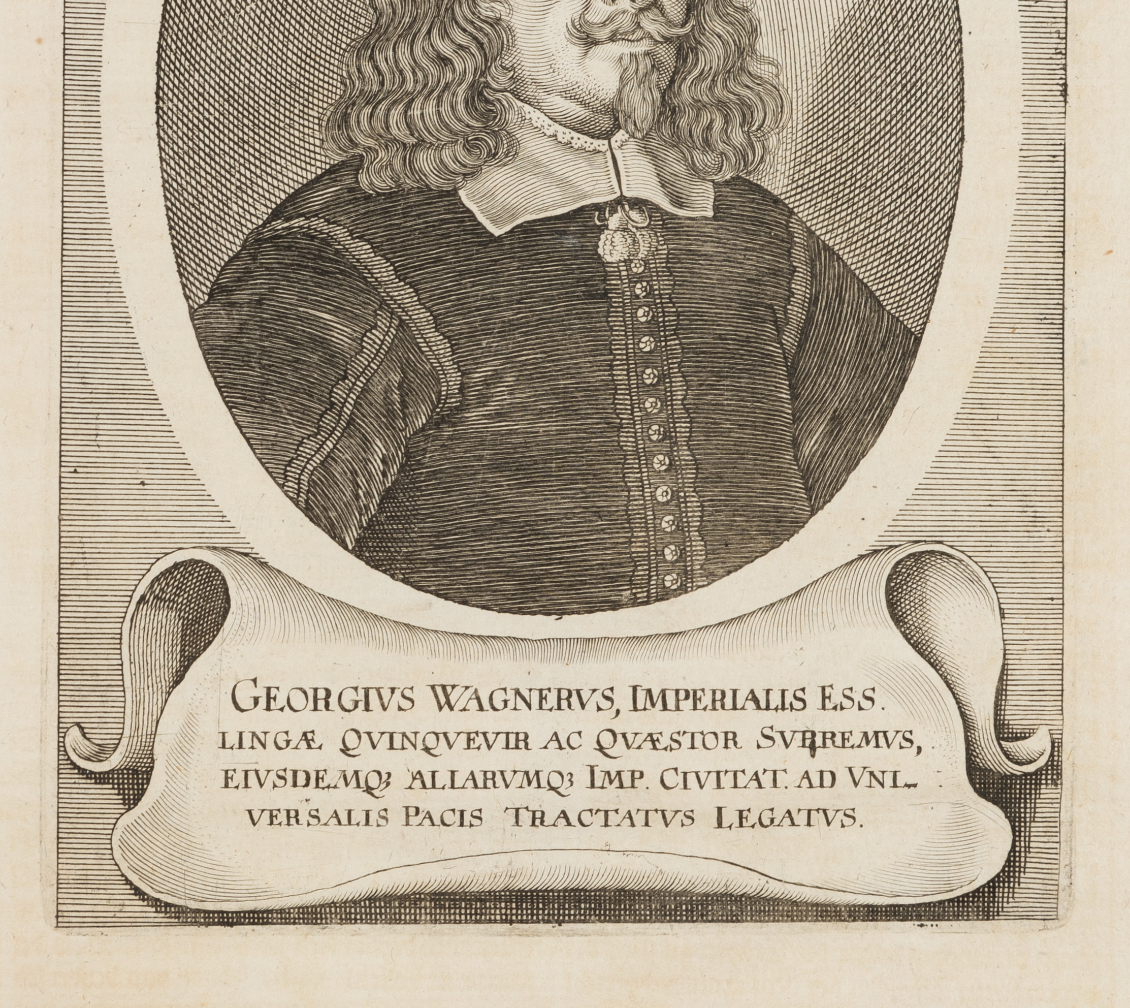 - Bezeichnung: Unten mittig im Druck bezeichnet: „GEORGIUS WAGNERUS, IMPERIALIS ESS. LINGAE QUINQUEVIR AC QUAESTOR SUPREMUSEIUSDEMO ALIARUMO [..]“.