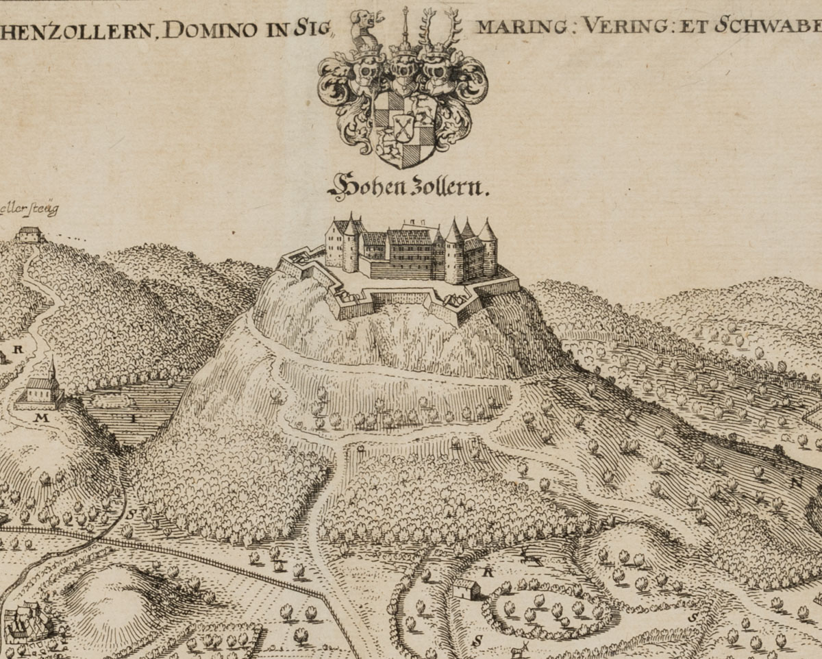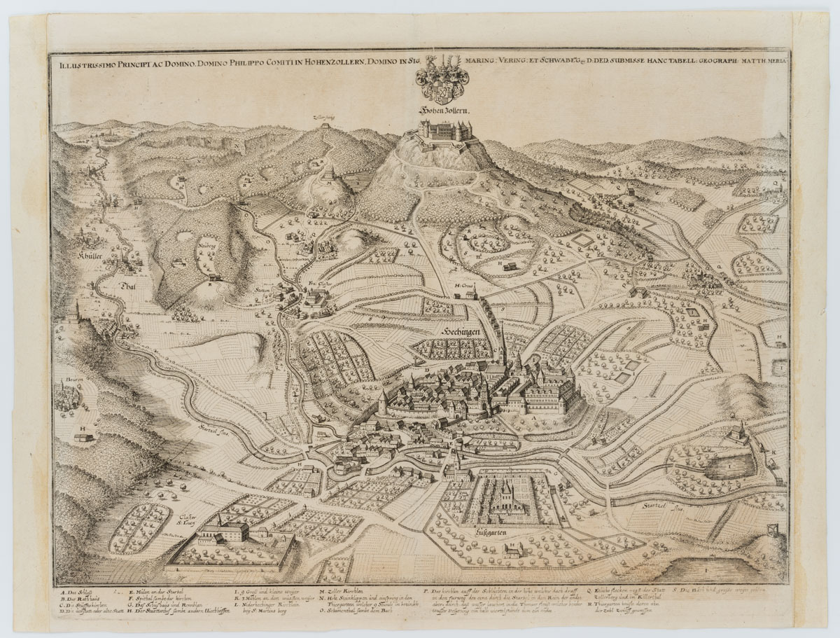 - Beschreibung: Radierung auf zwei mittig zusammengefügten Papieren. Diese Darstellung stammt aus dem zweiten Band des umfassenden Werkes Topographia Germaniae, das von Martin Zeller (1589 Ranten – 1661 Ulm) geschrieben und von Merian initiiiert sowie illustriert wurde. Die 16 Bände stellen bis heute ein einzigartiges Zeugnis früher topografischer Arbeit dar und beeindrucken durch die Genauigkeit der Darstellung. Das vorliegende Blatt stammt aus der ersten Auflage aus dem Jahr 1643. In der Vedute der Burg Hohenzollern über dem Ort Hechingen fällt die typische Darstellungsweise Merians auf. Trotz teils schematisierter Architektur werden markante Bauwerke stets mit Hinblick auf ihren individuellen Charakter dargestellt. Die Topographie nimmt alle wichtigen Erhebungen, Gewässer und Verkehrswege auf sowie große und kleine Siedlungen. Viele sind mit Verweisen versehen und in der unten abgedruckten Legende erklärt.