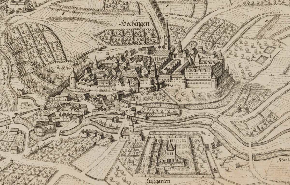 - Description: Etching on two papers joined in the centre. This depiction is from the second volume of the comprehensive work Topographia Germaniae, written by Martin Zeller (1589 Ranten – 1661 Ulm) and initiated and illustrated by Merian. The 16 volumes still represent a unique testimony of early topographical work and impress with the accuracy of the representation. The present sheet is from the first edition of 1643. In the veduta of Hohenzollern Castle above the town of Hechingen, Merian’s typical style of depiction is striking. Despite the partly schematised architecture, striking buildings are always depicted with regard to their individual character. The topography includes all important elevations, bodies of water and traffic routes as well as large and small settlements. Many are referenced and explained in the legend printed below.