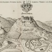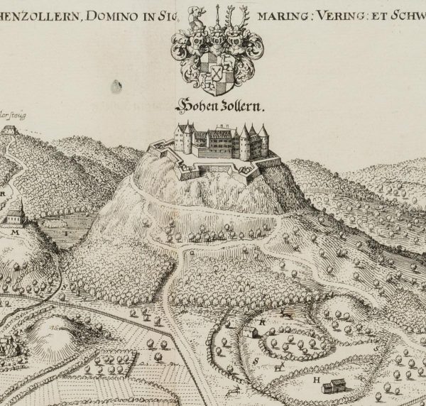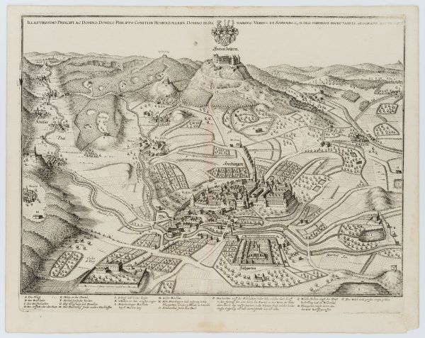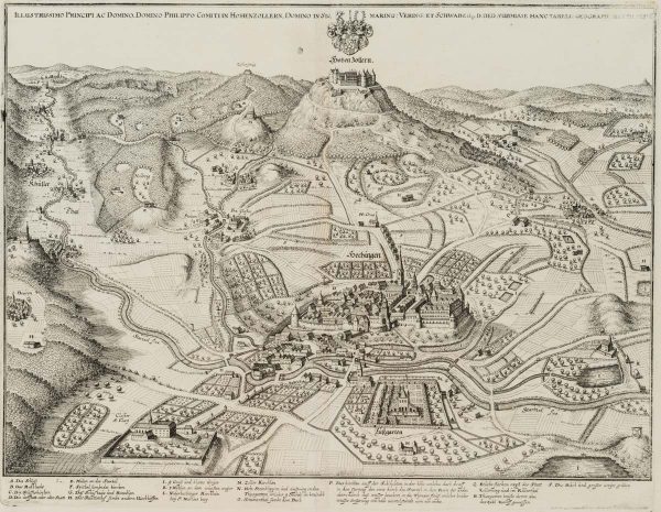 - Beschreibung: Radierung auf zwei mittig zusammengefügten Papieren. Diese Darstellung stammt aus dem zweiten Band des umfassenden Werkes Topographia Germaniae, das von Martin Zeller (1589 Ranten – 1661 Ulm) geschrieben und von Merian initiiiert sowie illustriert wurde. Die 16 Bände stellen bis heute ein einzigartiges Zeugnis früher topografischer Arbeit dar und beeindrucken durch die Genauigkeit der Darstellung. Das vorliegende Blatt stammt aus der zweiten Auflage aus dem Jahr 1656. In der Vedute der Burg Hohenzollern über dem Ort Hechingen fällt die typische Darstellungsweise Merians auf. Trotz teils schematisierter Architektur werden markante Bauwerke stets mit Hinblick auf ihren individuellen Charakter dargestellt. Die Topographie nimmt alle wichtigen Erhebungen, Gewässer und Verkehrswege auf sowie große und kleine Siedlungen. Viele sind mit Verweisen versehen und in der unten abgedruckten Legende erklärt.