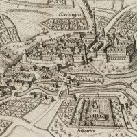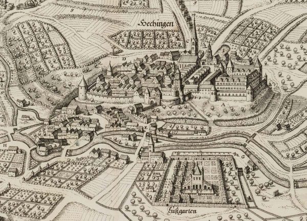 - Description: Etching on two papers joined in the centre. This depiction is from the second volume of the comprehensive work Topographia Germaniae, written by Martin Zeller (1589 Ranten – 1661 Ulm) and initiated and illustrated by Merian. The 16 volumes still represent a unique testimony of early topographical work and impress with the accuracy of the representation. The present sheet is from the second edition of 1656. In the veduta of Hohenzollern Castle above the town of Hechingen, Merian’s typical style of depiction is striking. Despite partly schematised architecture, striking buildings are always depicted with regard to their individual character. The topography includes all important elevations, bodies of water and traffic routes as well as large and small settlements. Many are referenced and explained in the legend printed below.