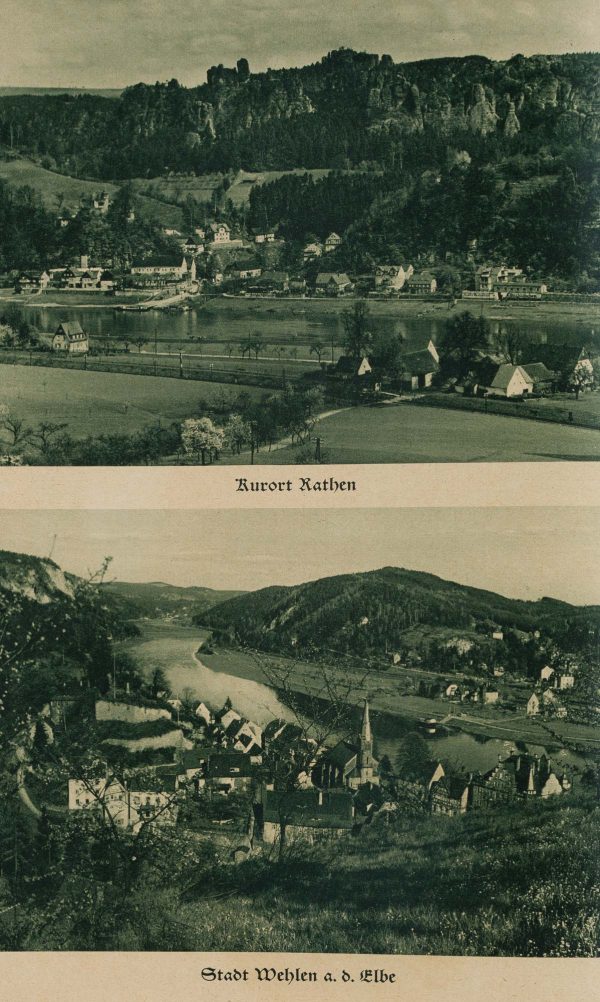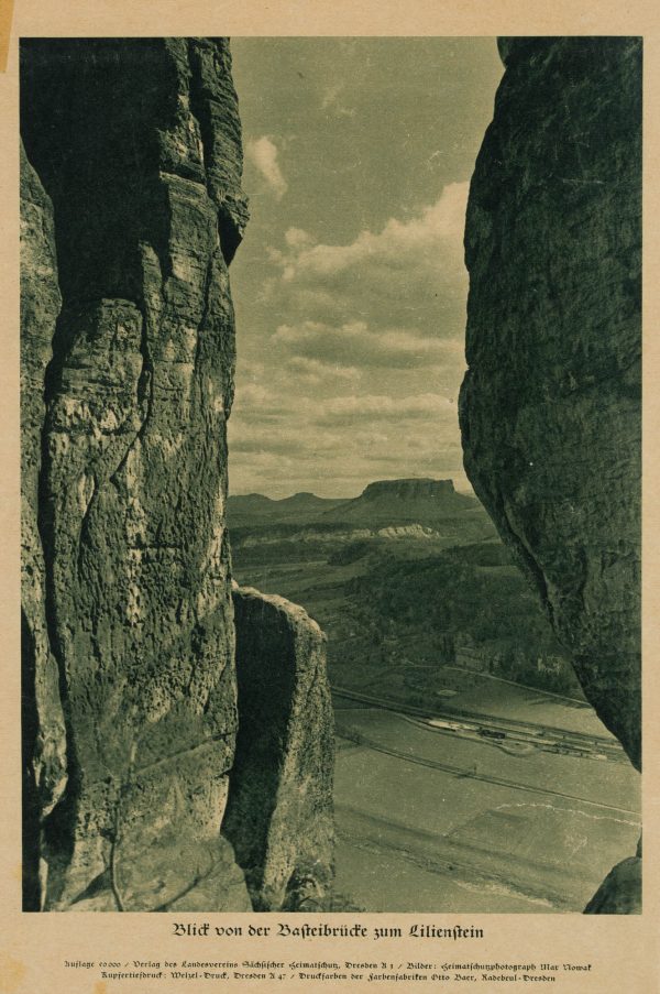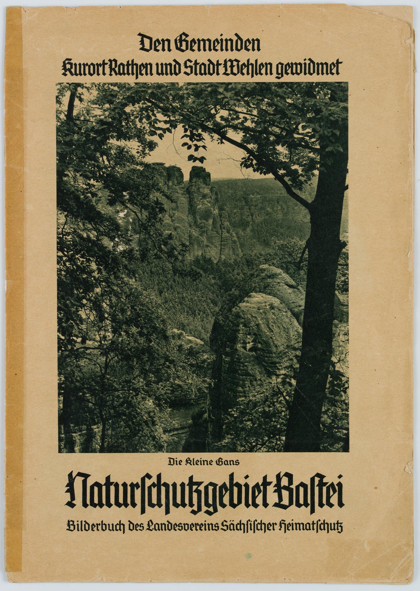 - Description: With numerous photographs by Max Nowak (1881-1956), Heimatschutz photographer, including: Kurort Rathen, Stadt Wehlen, View from the Babteiaussicht to the Babteibrücke, View to the Lilienstein. Publisher: Landesverein Sächsischer Heimatschutz. “Edition 50000 / Publisher: Landesverein Sächsischer Heimatschutz, Dresden. Rotogravure: Welzel-Druck, Dresden; inks of Farbenfabriken Otto Baer, Radebeul-Dresden.