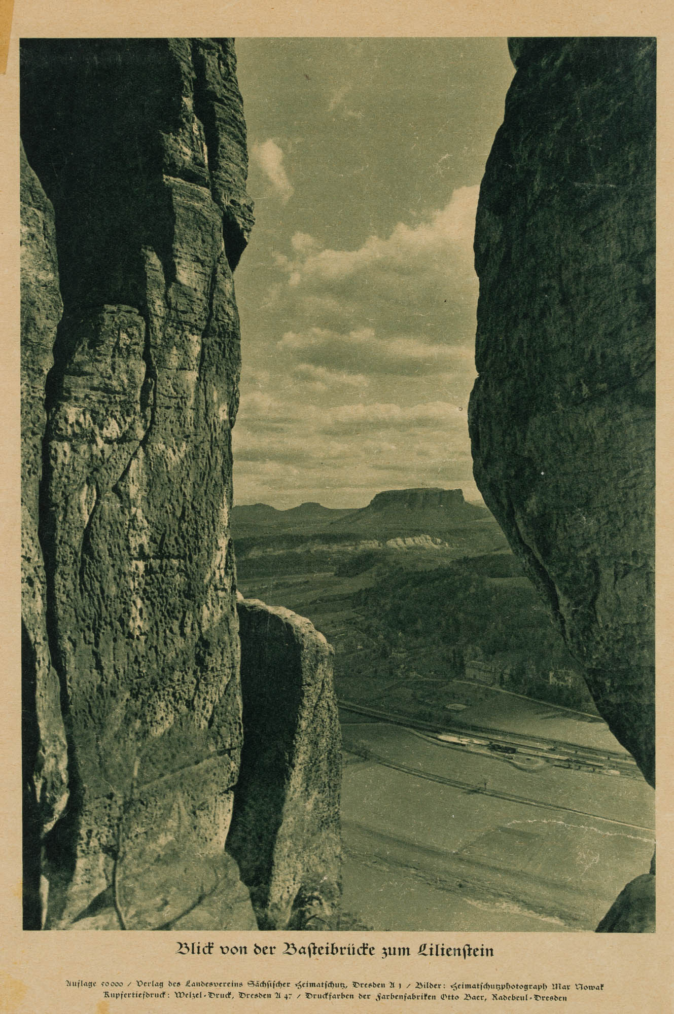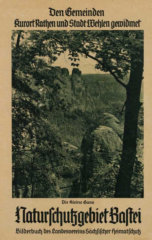 - Beschreibung: Mit zahlreichen Fotografien von Max Nowak (1881-1956), Heimatschutzfotograf, u.a.: Kurort Rathen, Stadt Wehlen, Blick von der Babteiaussicht nach der Babteibrücke, Blick zum Lilienstein. Herausgeber: Landesverein Sächsischer Heimatschutz. “Auflage 50000 / Verlag des Landesvereins Sächsischer Heimatschutz, Dresden. Kupfertiefdruck: Welzel-Druck, Dresden; Druckfarben der Farbenfabriken Otto Baer, Radebeul-Dresden.