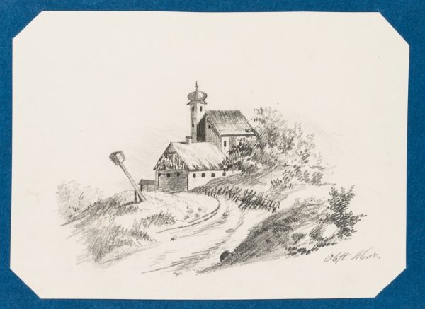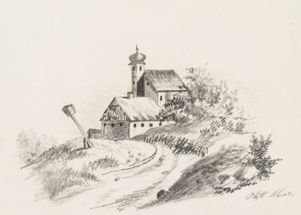 M. Obst (19. Jahrhundert), Weg zu einer Kirche mit Scheune, 19. Jahrhundert, Bleistift