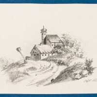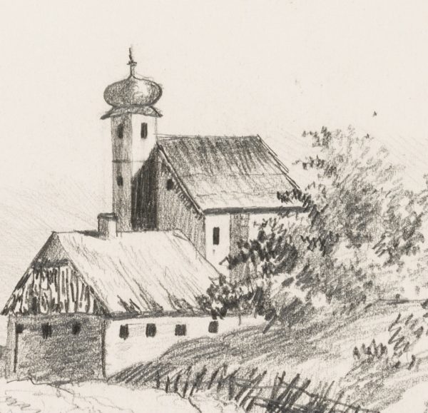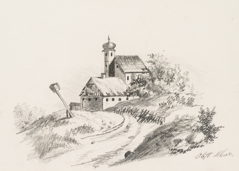 M. Obst (19th century), Way to a church with a barn, 19th century, Pencil