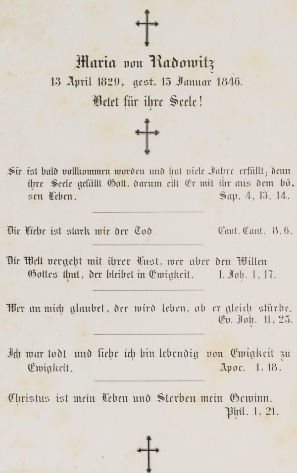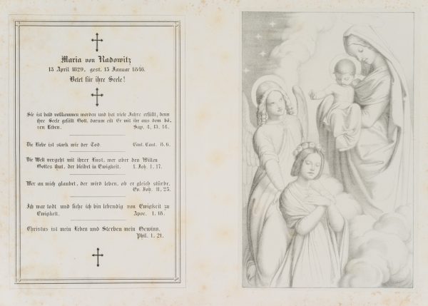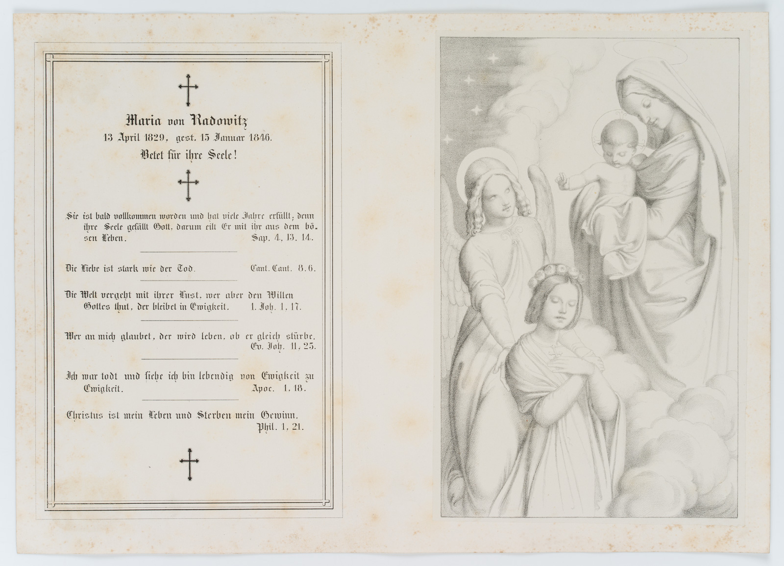 - Beschreibung: Auf der linken Bildhälfte bezeichnet mit “Maria von Radowitz / 13 April 1829, gest. 15 Januar 1846. / Betet für ihre Seele!” sowie mit Bibelversen “Wer an mich glaubt, der wird leben, ob er gleich stürbe Joh. 11,25″. Zur Rechten Darstellung der Gottesmutter mit Jesuskind und Engel”.