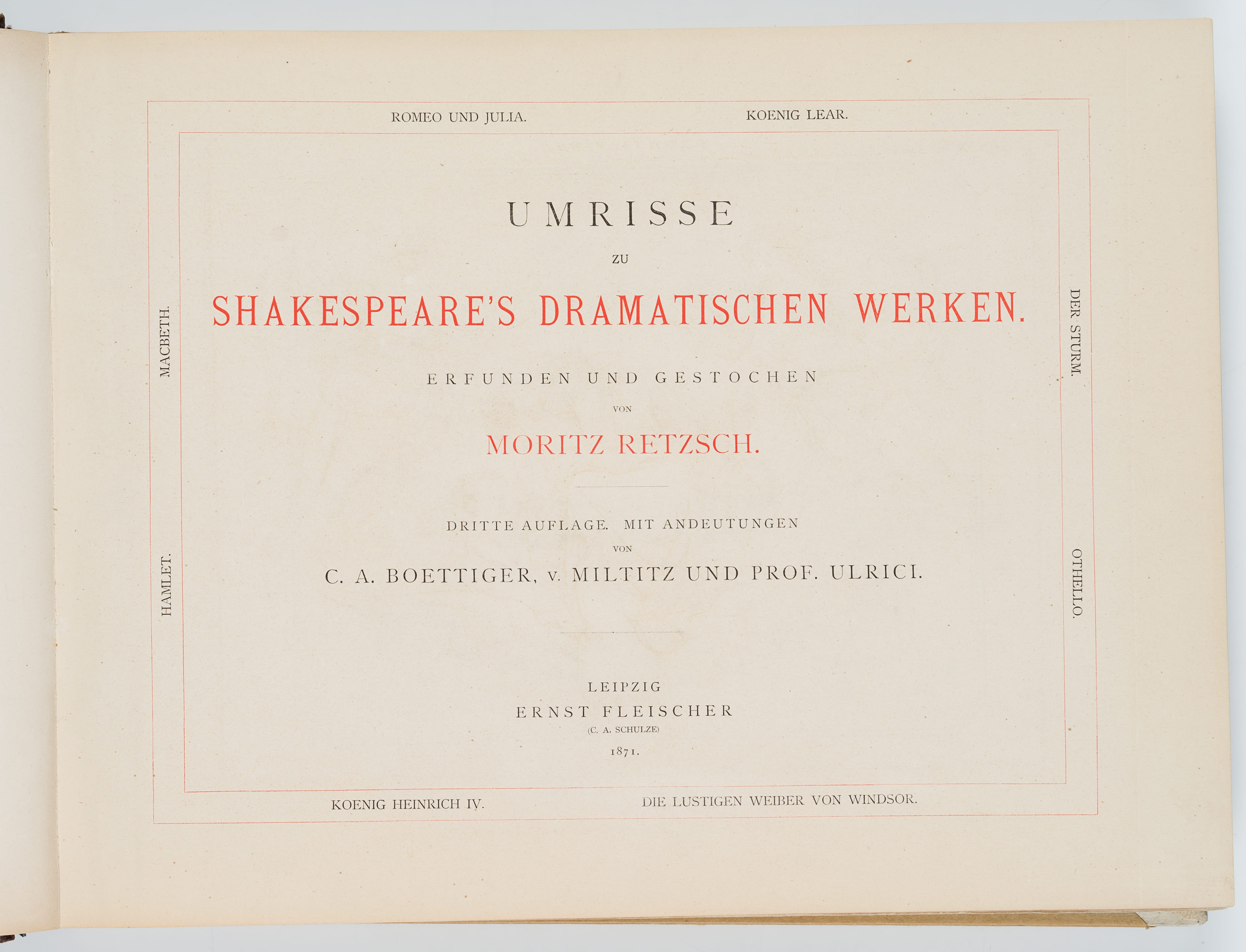 - Schlagworte: Umriss, Theater, Shakespeare, Illustrationen, Mythologie, Historie, Deutschland, Romantik, 1850-1899