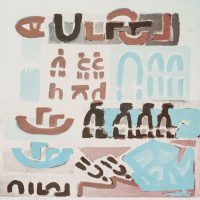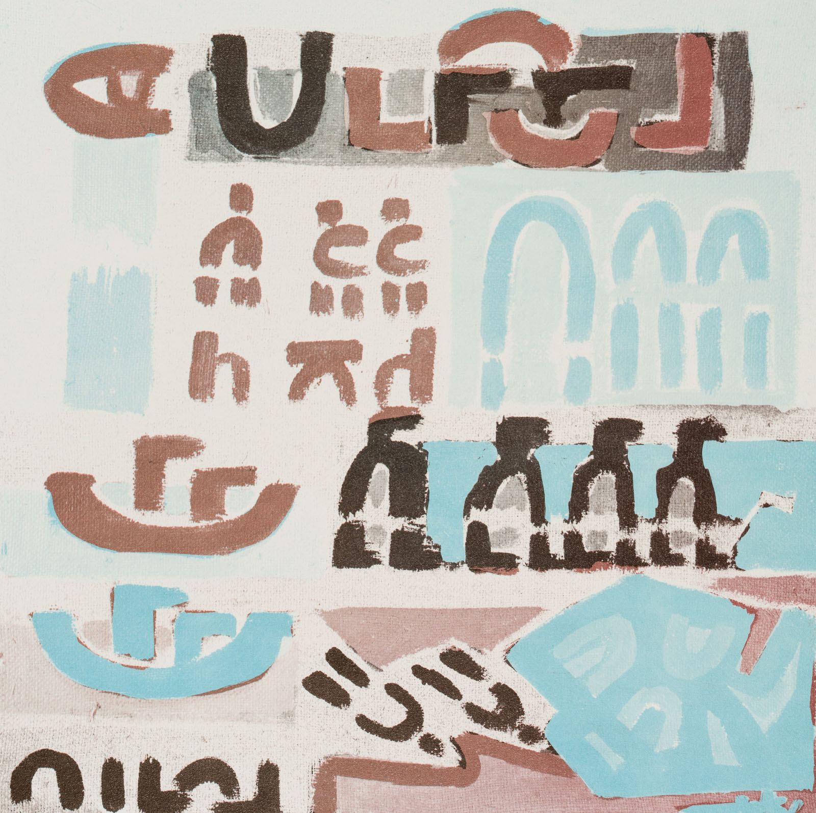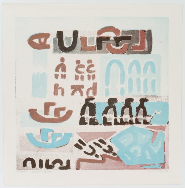 Mike Rose (1932 – 2006 ), Geometric abstract characters in blue, brown and black, 1973, Offset printing