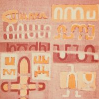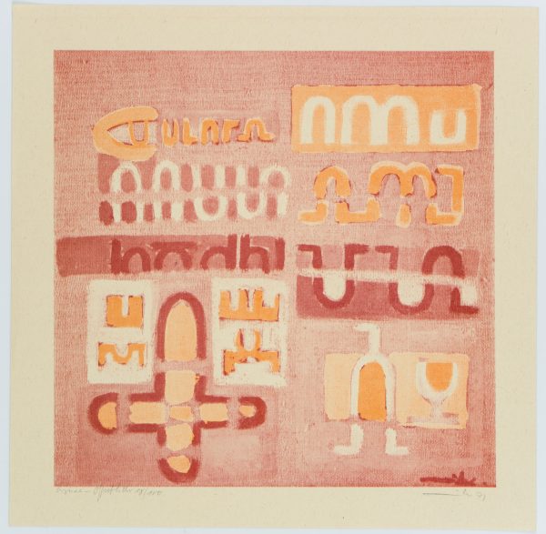 Mike Rose (1932 – 2006 ), Geometric abstract characters in red, orange and white, 1973, Offset printing
