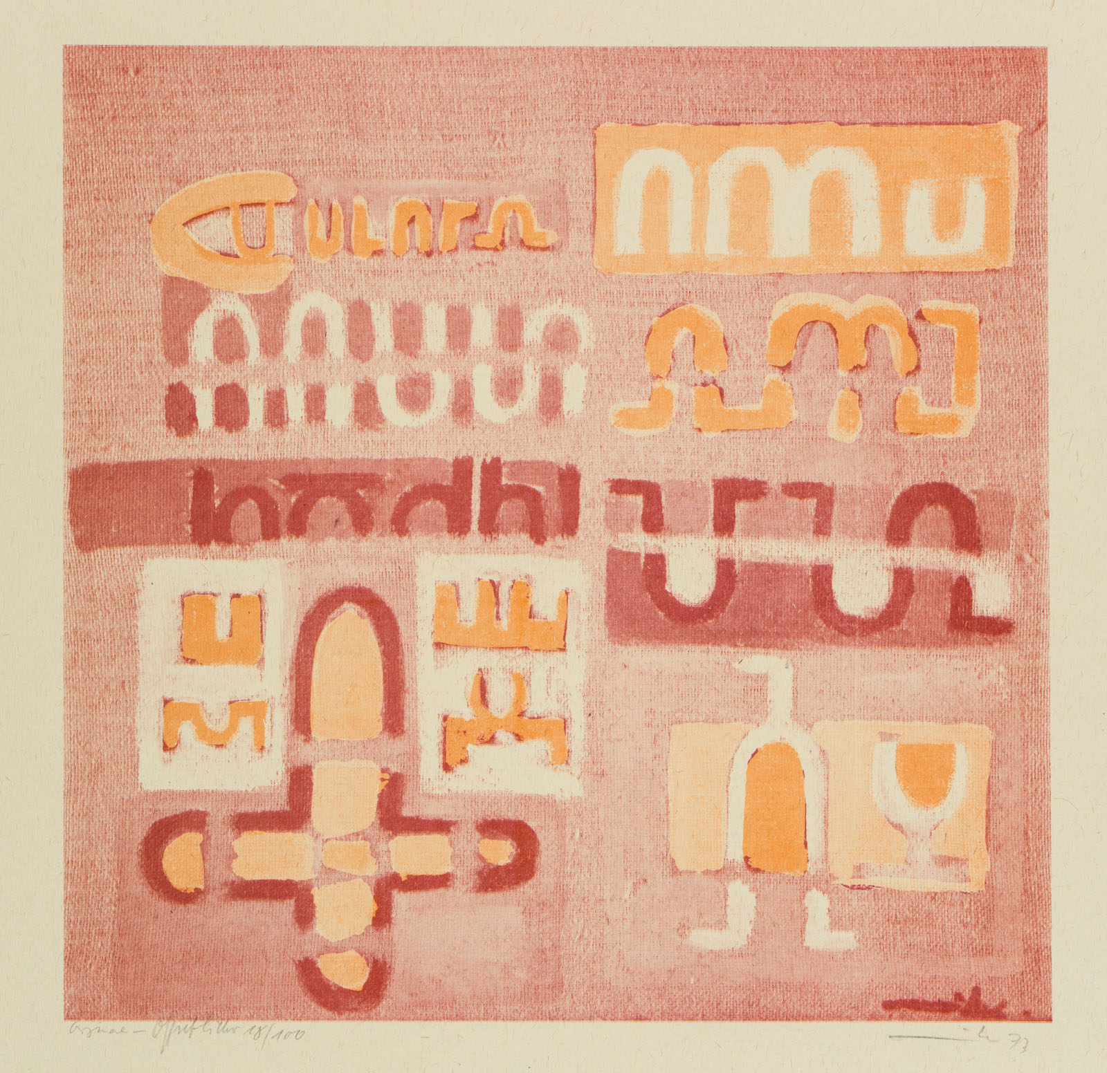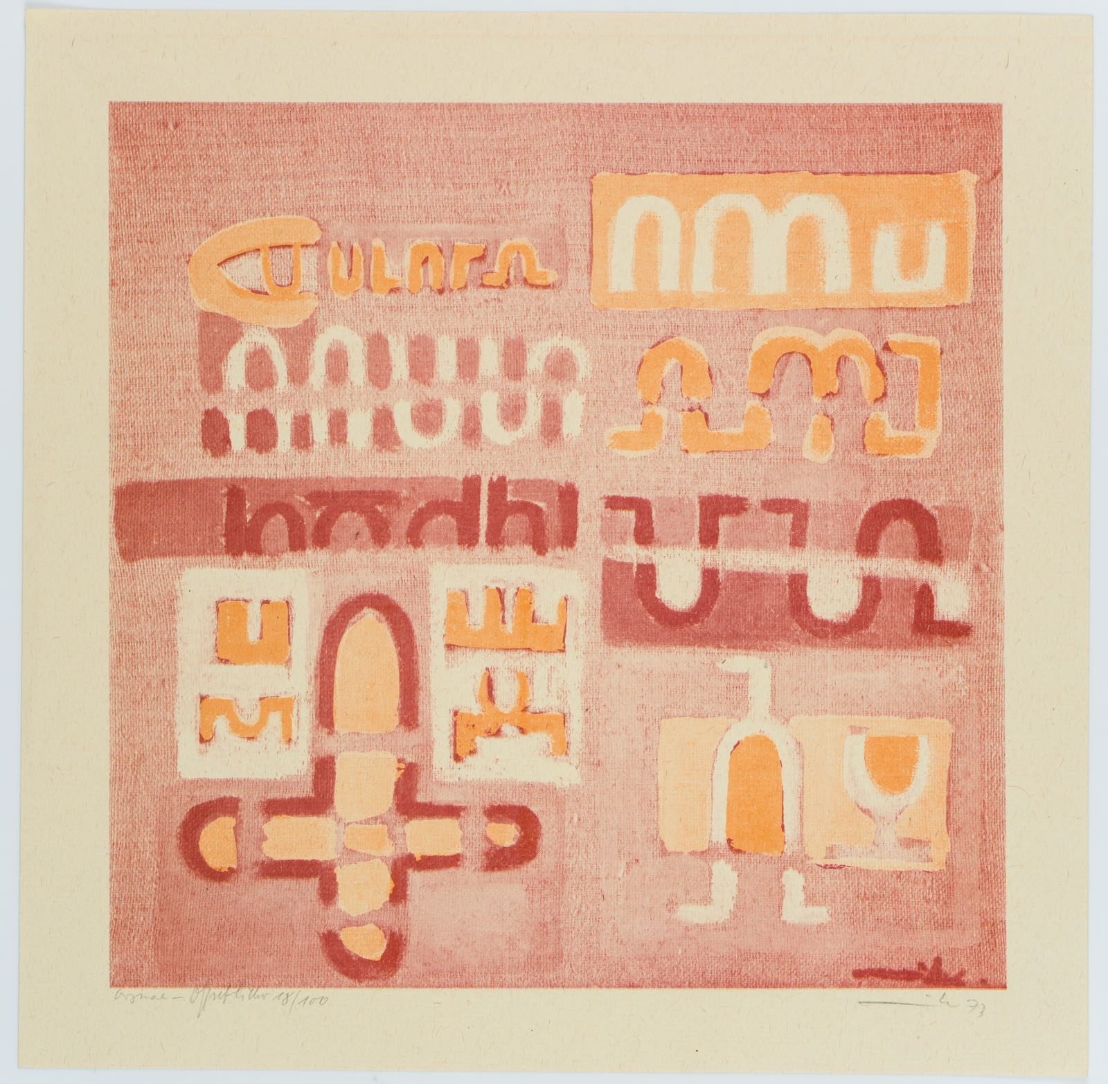 Mike Rose (1932 – 2006 ), Geometrisch abstrakte Zeichen in Rot, Orange und Weiß, 1973, Offsetdruck