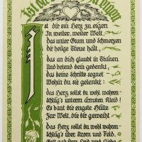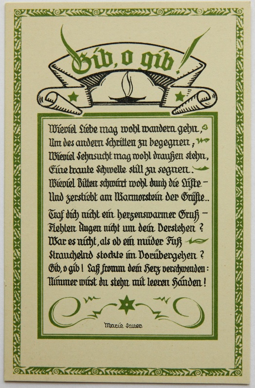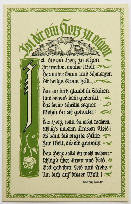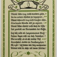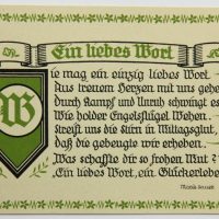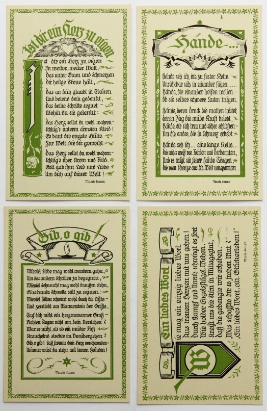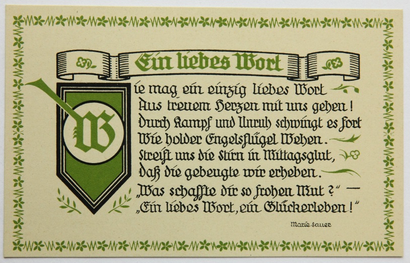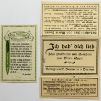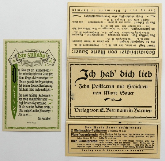 - Bezeichnung: Unterhalb der Darstellung und der Texte jeweils im Druckstock signiert. Rückseitig ist jeweils mit üblichem Postkartenlayout versehen und im Druck bezeichnet mit “Marie Sauer Postkarten – Serie 1 “Liebe” 5 Karten – Verlag E.Biermann, Barmen”.