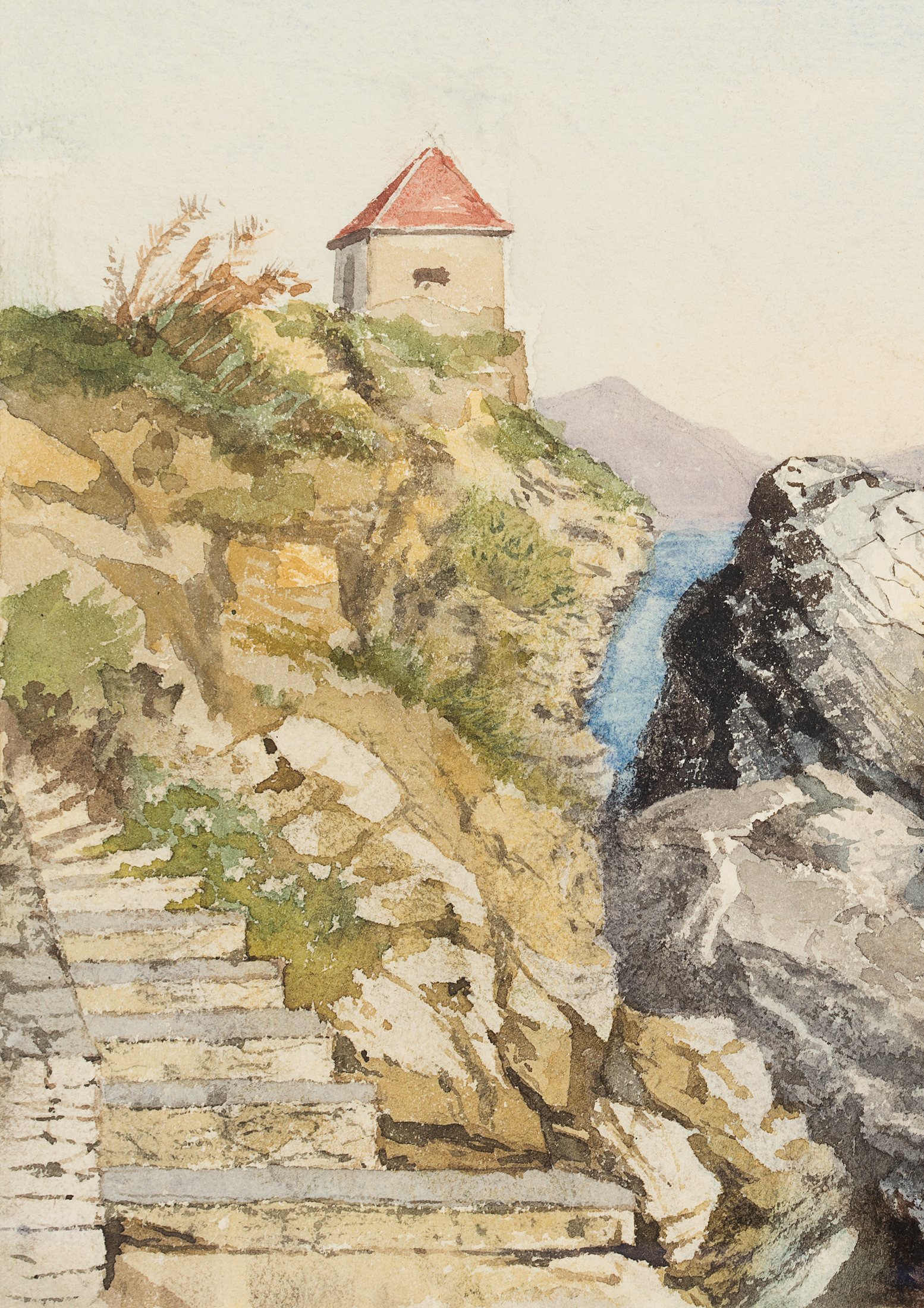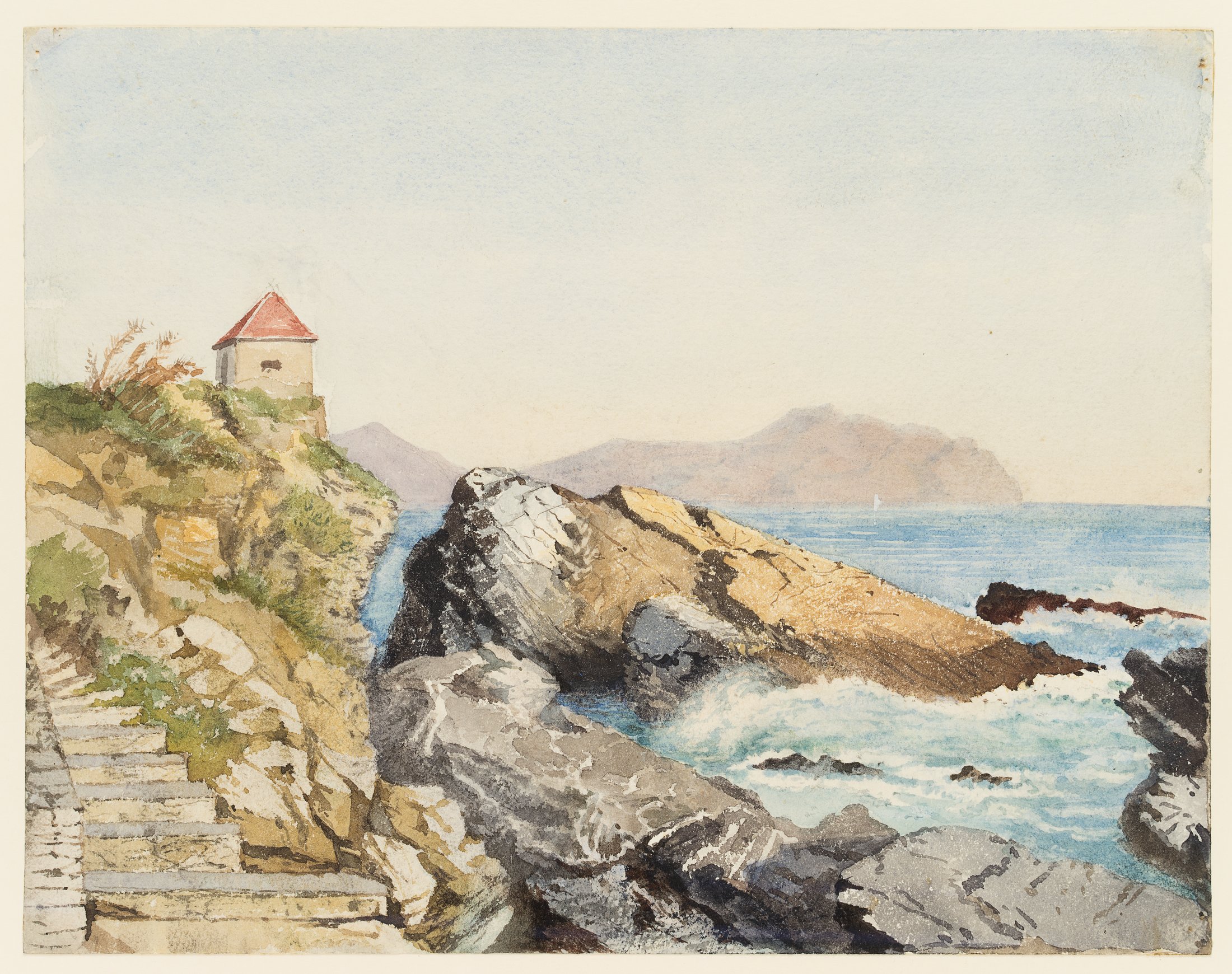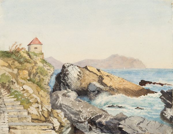 Not far from Genoa on the Ligurian coast is the beach at Nervi, shown here with a view of a small guard post. As the wife of a diplomat, Marie von Savigny was one of the few artists of her time to undertake a journey to this equally remote and picturesque location. Obviously impressed by the varied play of colours on the coastline, blue tones in the sky and on the surface of the water, grey and black tones on the rugged cliffs and green and brown tones on the shores of the sea, she devotes herself here to the transition between land and sea. With the angular rock in the centre of the picture, the unruly nature of the ocean, which causes even hard stone to burst, is in the foreground. However, human intervention in the form of a small shelter and a staircase carved into the rock is also thematised and contributes to an exciting dialogue, as do the clashing colours and land and sea structures.