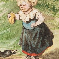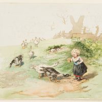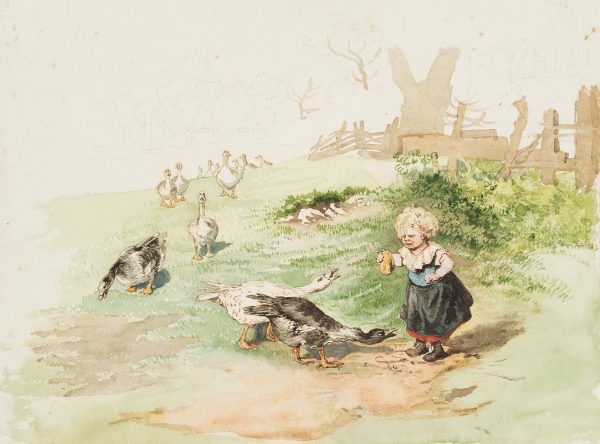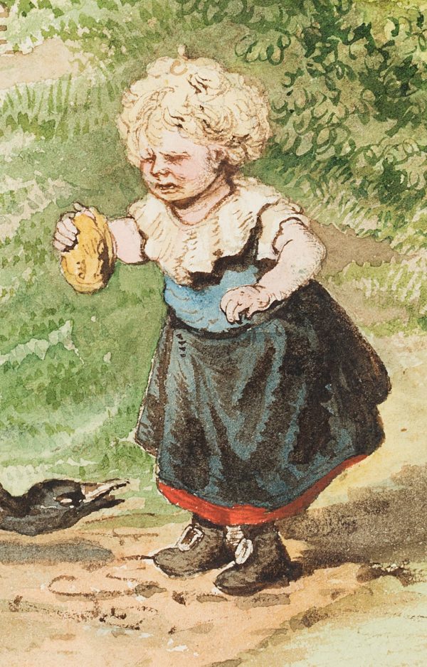 As one of the few genre paintings by the artist Marie von Savigny, this scene on the edge of a village is in any case a special one; in this case, the unusual motif makes the watercolour an almost curious one-off. In loving detail, Marie von Savigny drew here the features of a girl with red cheeks and blond curls who finds herself harassed by a flock of – hardly less keenly observed and drawn – geese. The reason for the surely noisy confrontation is the bun the girl is holding. Two of the geese are already standing close to her, chattering violently and snatching at the bread, a whole group of other geese approaching from the horizon. Despite the threatening backdrop for the girl, the artist – perhaps also the child’s mother – found a charm in the depiction of this scene, which indeed contains something exhilarating. Thus, on the one hand, the scowling expression on the face of the little girl in this overall probably still harmless scene, who is afraid for her treat, is amusing; on the other hand, the comedy is found above all in the approaching geese, which waddle in single file into the foreground and want to claim their piece of the “cake”.