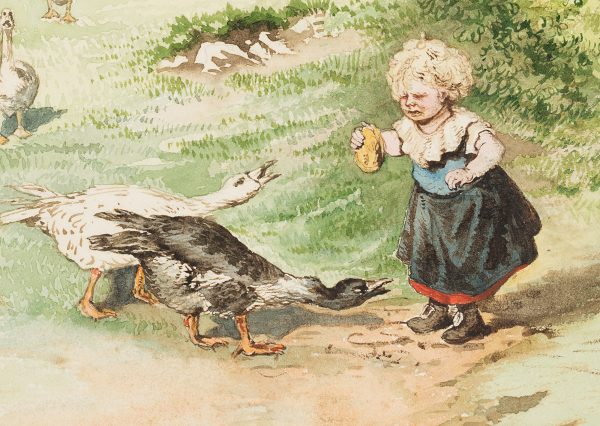 Als eines der wenigen Genrebilder der Künstlerin Marie von Savigny stellt dieses Szene an einem Ortsrand ohnehin eine Besonderheit dar, das ungewöhnliche Motiv macht das Aquarell in diesem Fall zu einem beinahe kuriosen Einzelstück. In liebevoller Detailarbeit, zeichnete Marie von Savigny hier die Züge eines Mädchens mit roten Wangen und blonden Locken, das sich von einer Schar – kaum weniger scharf beobachteter und gezeichneter – Gänse bedrängt sieht. Der Grund für die sicher lautstarke Auseinandersetzung ist das Brötchen, das das Mädchen in der Hand hält. Zwei der Gänse stehen bereits dicht bei ihr, schnattern heftig und schnappen nach dem Brot, eine ganze Gruppe weiterer Gänse naht vom Horizont her. Trotz der Drohkulisse für das Mädchen, fand die Künstlerin – vielleicht auch Mutter des Kindes – einen Reiz in der Darstellung dieser Szene, die in der Tat etwas Erheiterndes enthält. So belustigt einerseits der missmutige Gesichtsausdruck der Kleinen in dieser insgesamt wohl noch ungefährlichen Szene, die Angst um ihre Leckerei hat, andererseits findet sich die Komik vor allem in den herannahenden Gänsen, die im Gänsemarsch in den Vordergrund watscheln und ihr Stück vom “Kuchen” beanspruchen wollen.