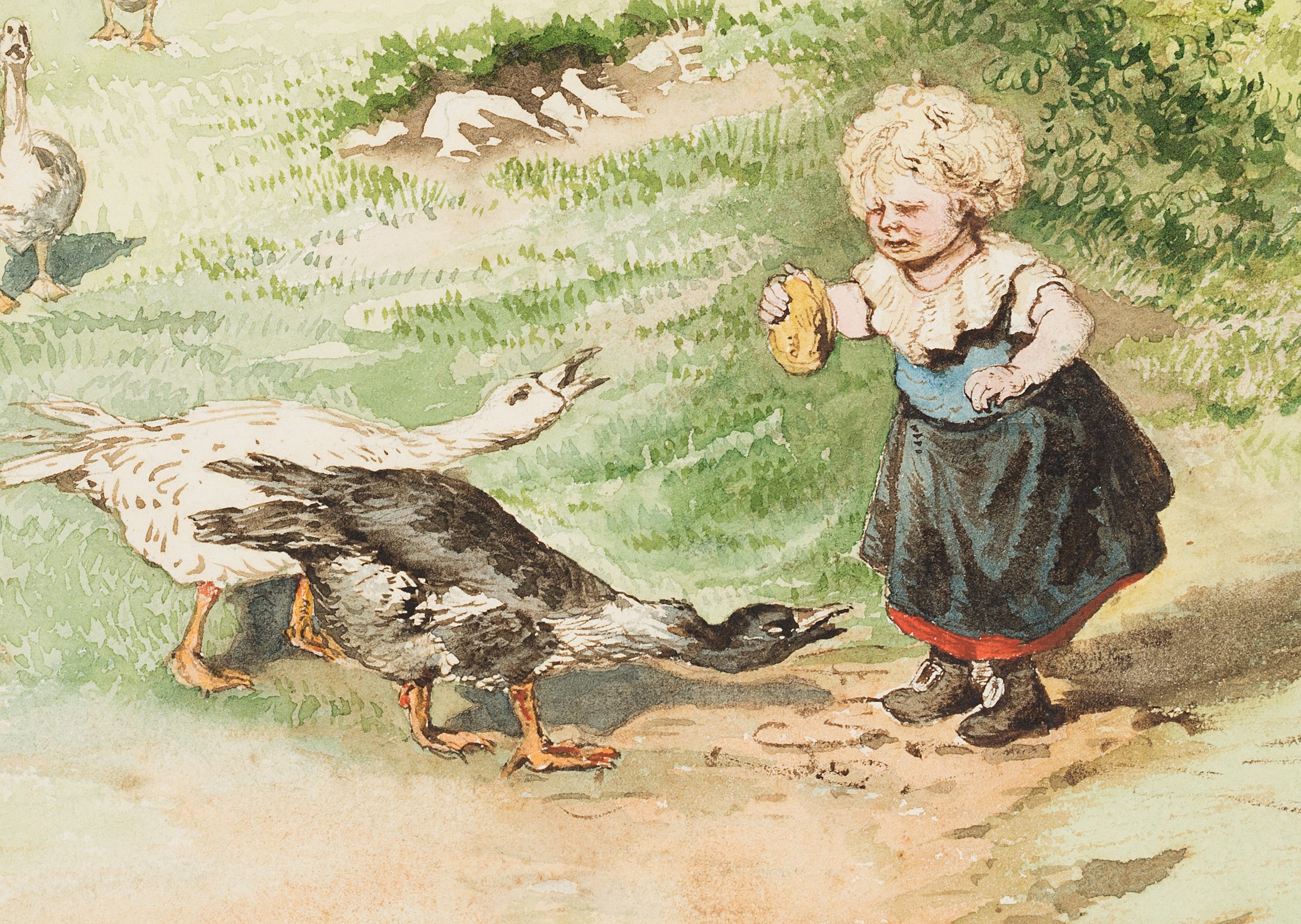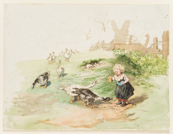 Marie von Savigny (1831 Boitzenburg – 1905 ), Missmutige Gänseliesl mit hungriger Gänseschar, um 1870, Aquarell