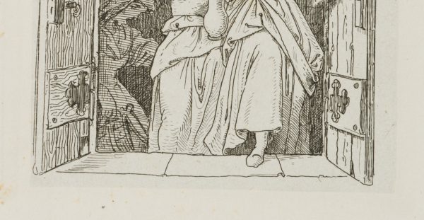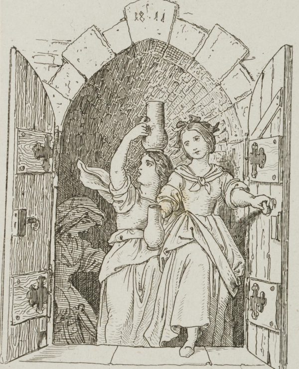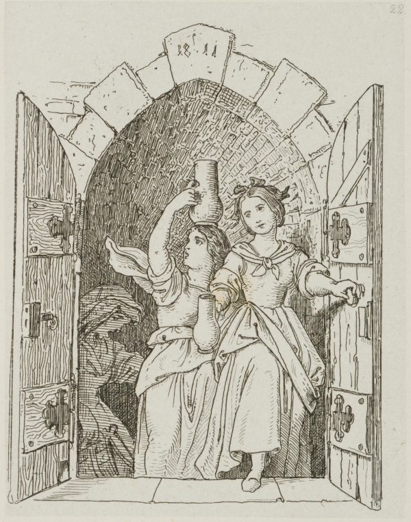 - Description: Three ladies, the first two with their jugs and the last with a vat in her hands, climb a cellar staircase. The first carries the jug gracefully in front of her, the second balances her somewhat larger one jauntily on her head, the third and last in turn drags the vat groaning with one hand so that the contents are safely spilled. The etching is from an album published in 1875 with 42 small-format etchings by Moritz von Schwind and poems/verses by Ernst Freiherr von Feuchtersleben on the subject of “smoking” and “drinking” (In vino veritas). The explanatory text for this depiction in the album reads: “Keep this in mind: once: lovely to look at; twice: head and jug waver, three times: it will pass! Four times, five times and so on, I’d rather not see at all: strong remain those, and cheerful, who understand the right measure”.