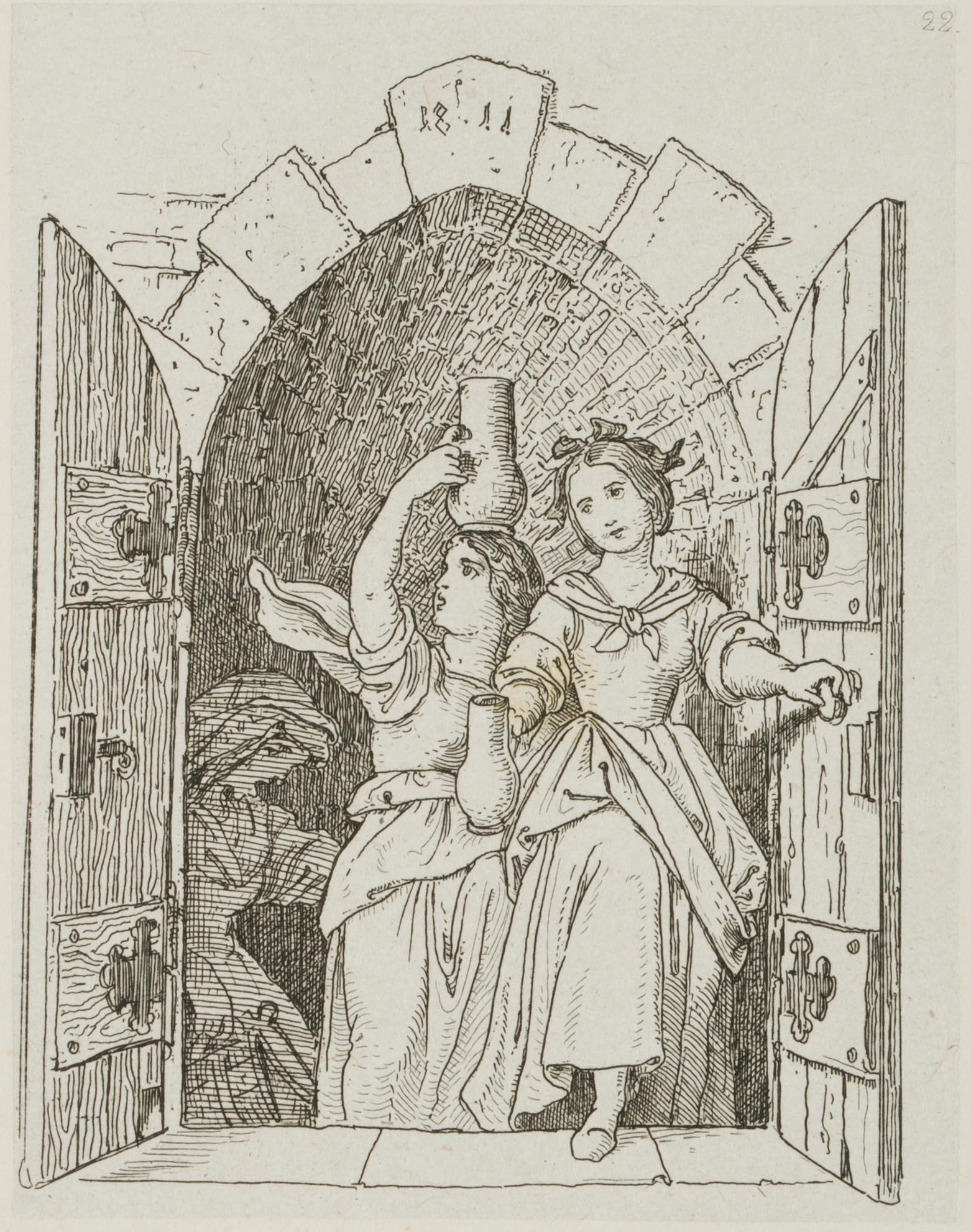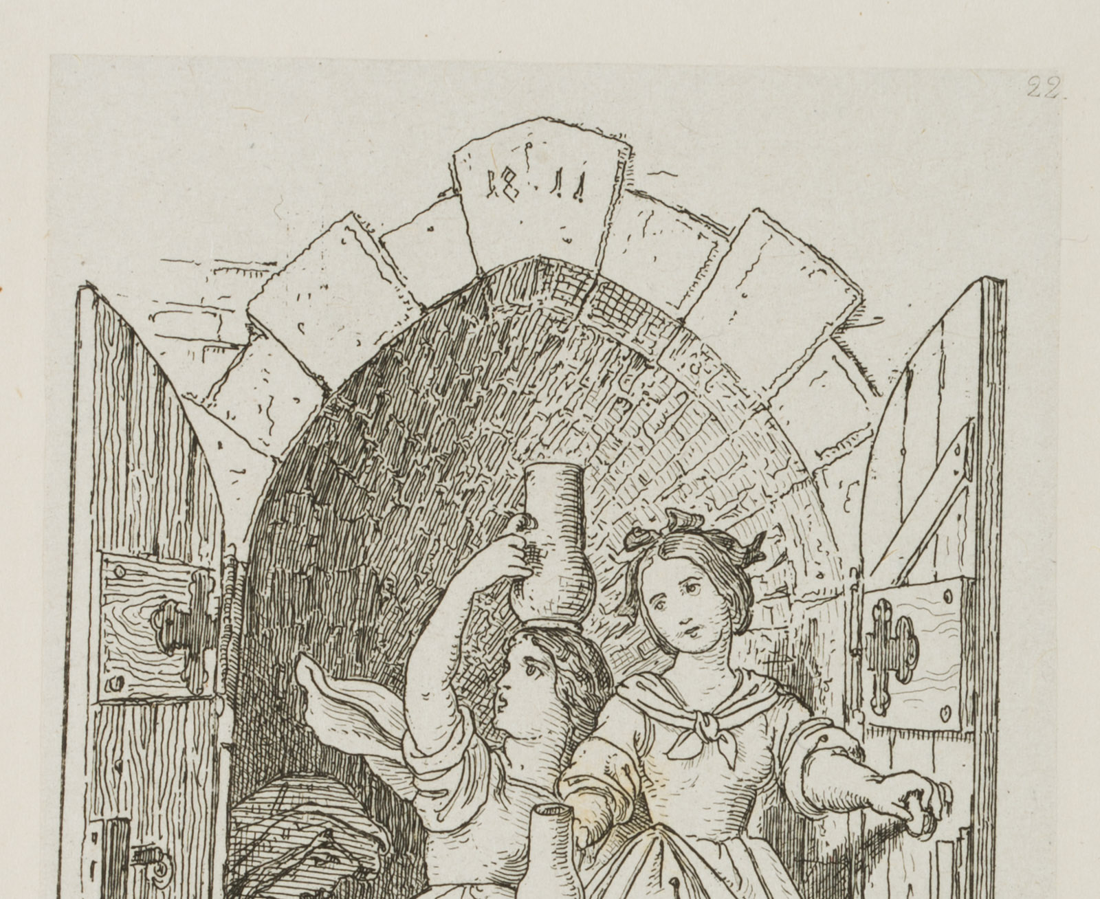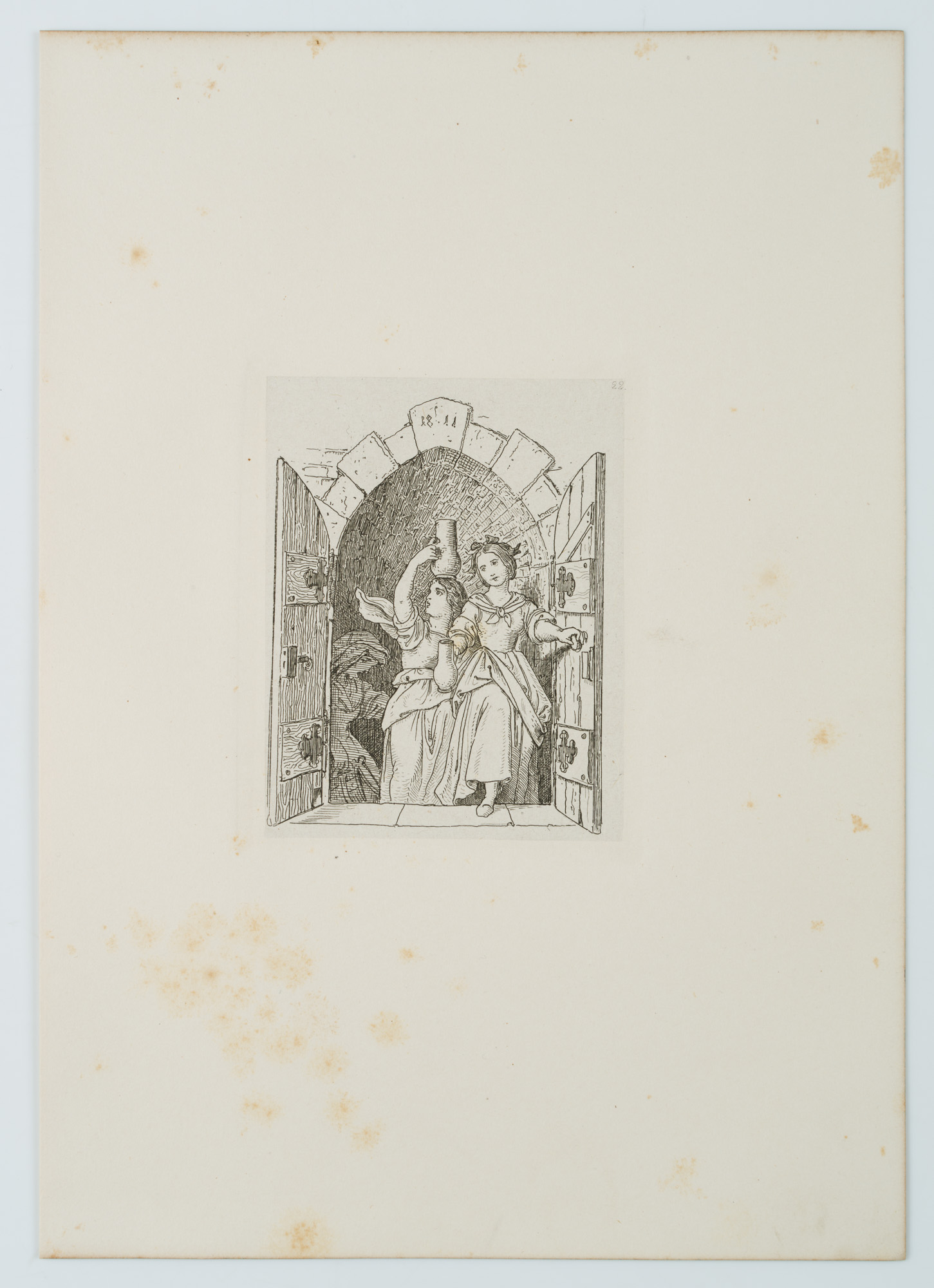 - Description: Three ladies, the first two with their jugs and the last with a vat in her hands, climb a cellar staircase. The first carries the jug gracefully in front of her, the second balances her somewhat larger one jauntily on her head, the third and last in turn drags the vat groaning with one hand so that the contents are safely spilled. The etching is from an album published in 1875 with 42 small-format etchings by Moritz von Schwind and poems/verses by Ernst Freiherr von Feuchtersleben on the subject of „smoking“ and „drinking“ (In vino veritas). The explanatory text for this depiction in the album reads: „Keep this in mind: once: lovely to look at; twice: head and jug waver, three times: it will pass! Four times, five times and so on, I’d rather not see at all: strong remain those, and cheerful, who understand the right measure“.