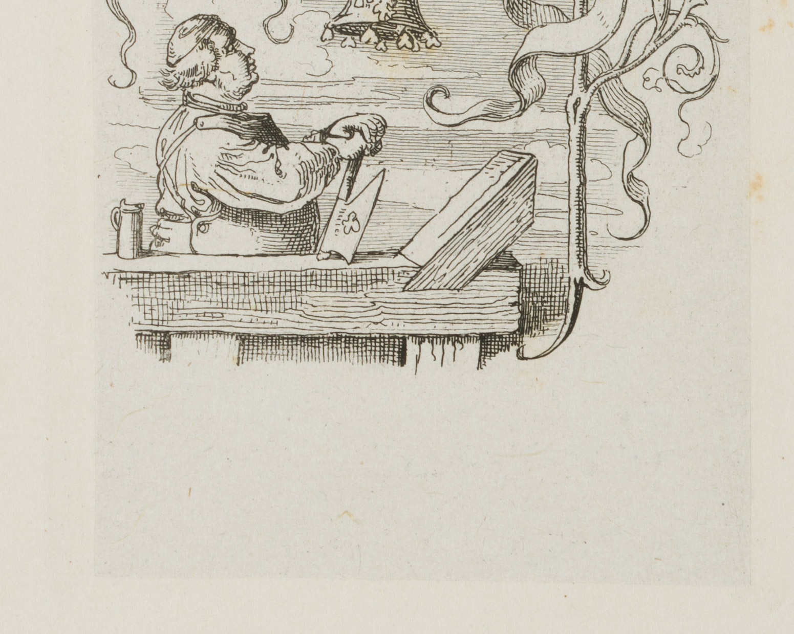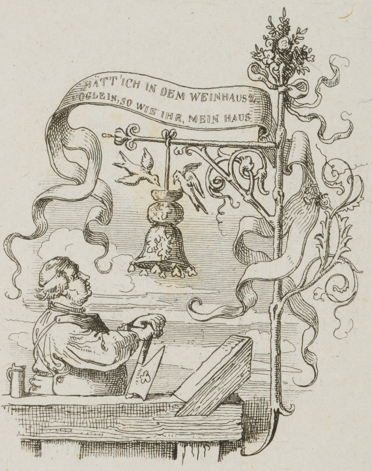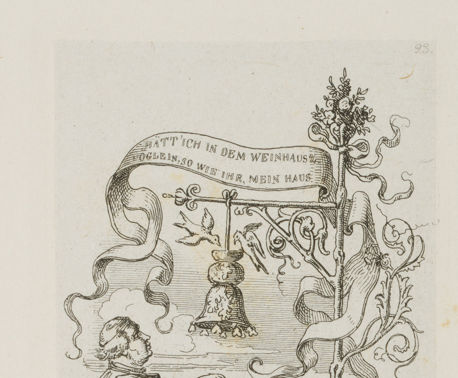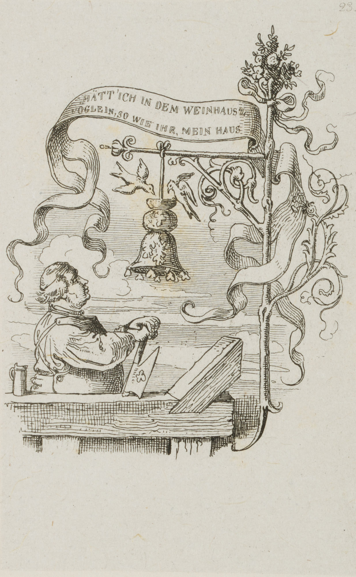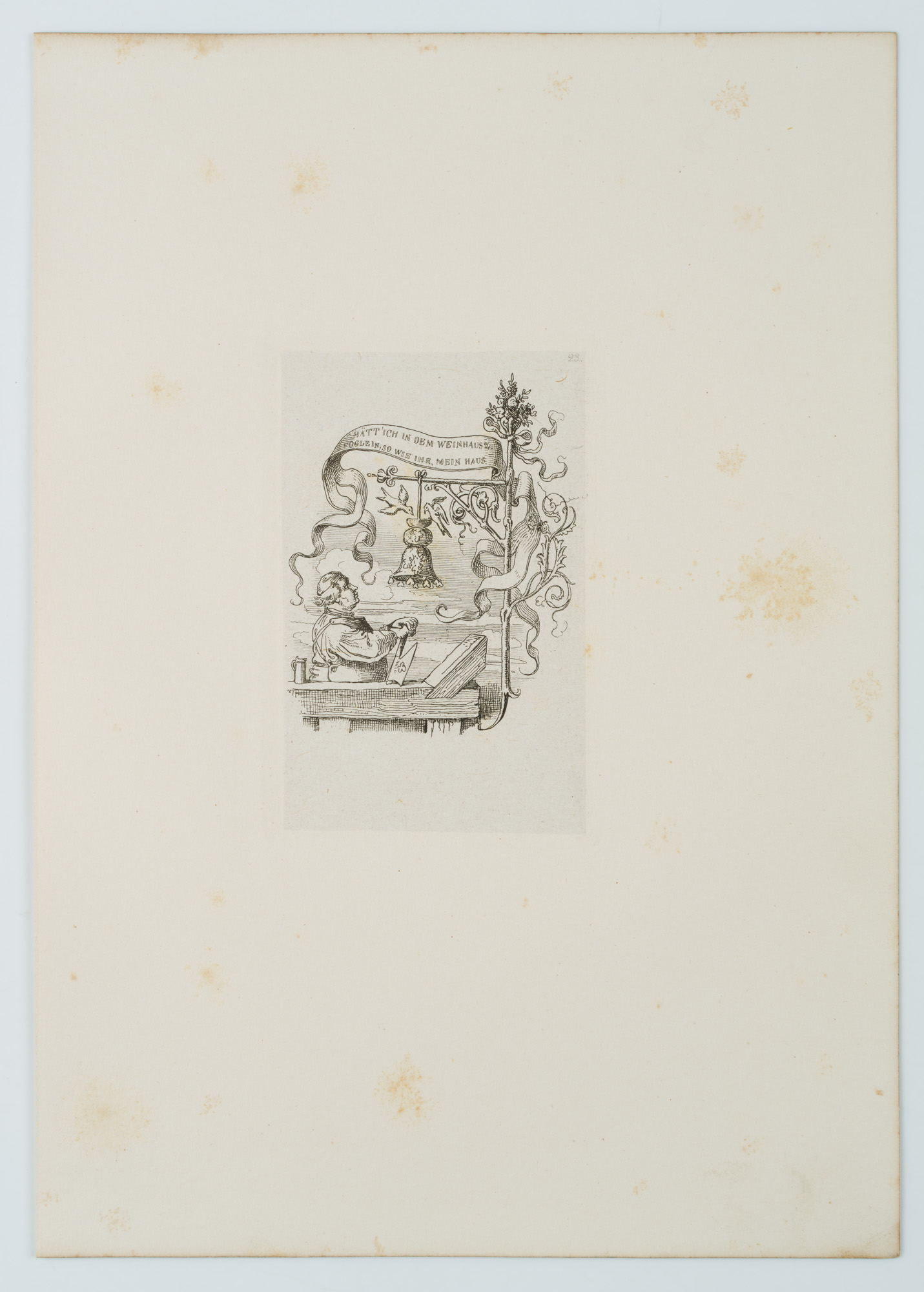 - Description: Numbered “23” on the plate at the top right above the depiction. Our gaze falls on a richly decorated wine house sign with birds and a bell overhung by a banner with the beginning of the explanatory verse. Below a craftsman with his tools contemplating the birds. The etching is from an album published in 1875 with 42 small-format etchings by Moritz von Schwind and poems/verses by Ernst Freiherr von Feuchtersleben on the subject of “smoking” and “drinking” (In vino veritas). The explanatory text for this depiction in the album reads: “If I had little birds in the wine house sign, like you my house, I would not give way to an enemy, work would not bring me out! We are little birds; we may paint, chirp, and build our nests: Man, you will have a beautiful sign: you should look at your day’s work!