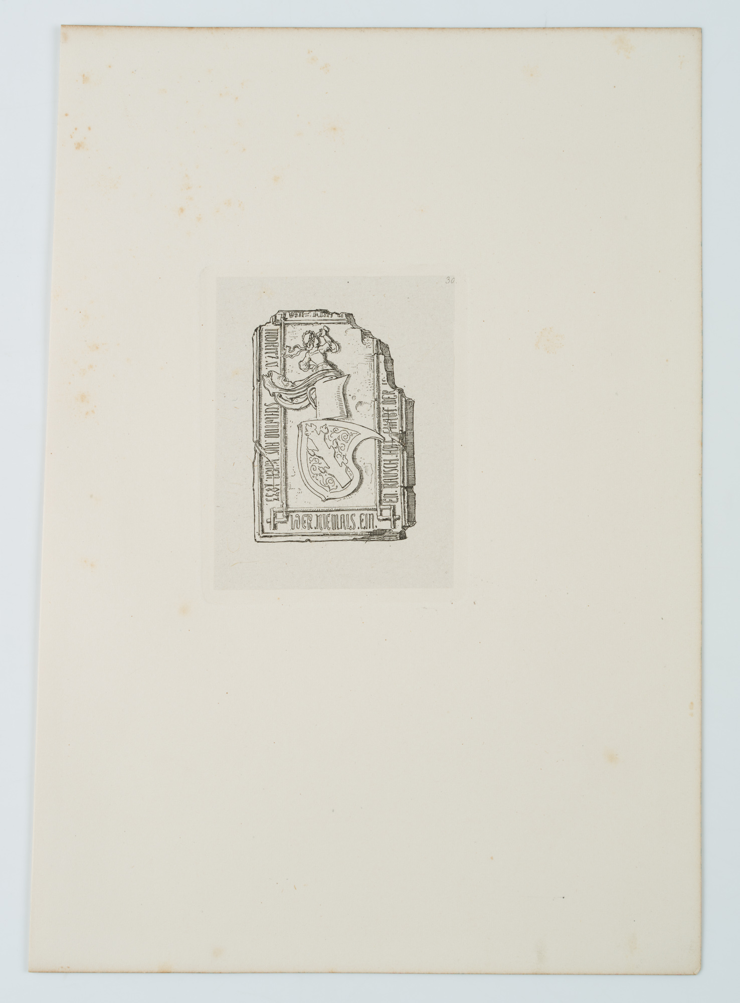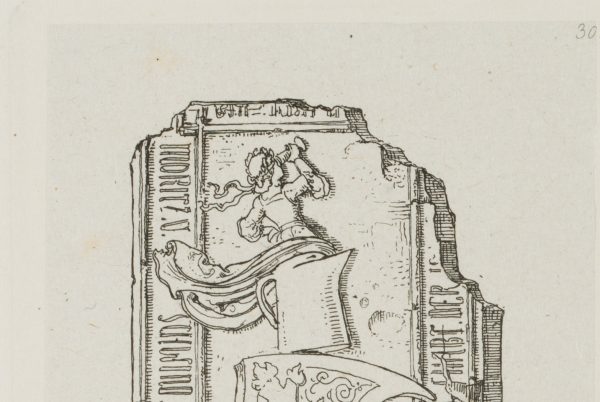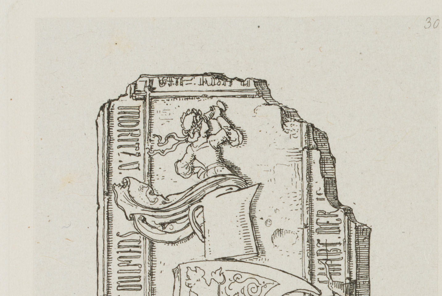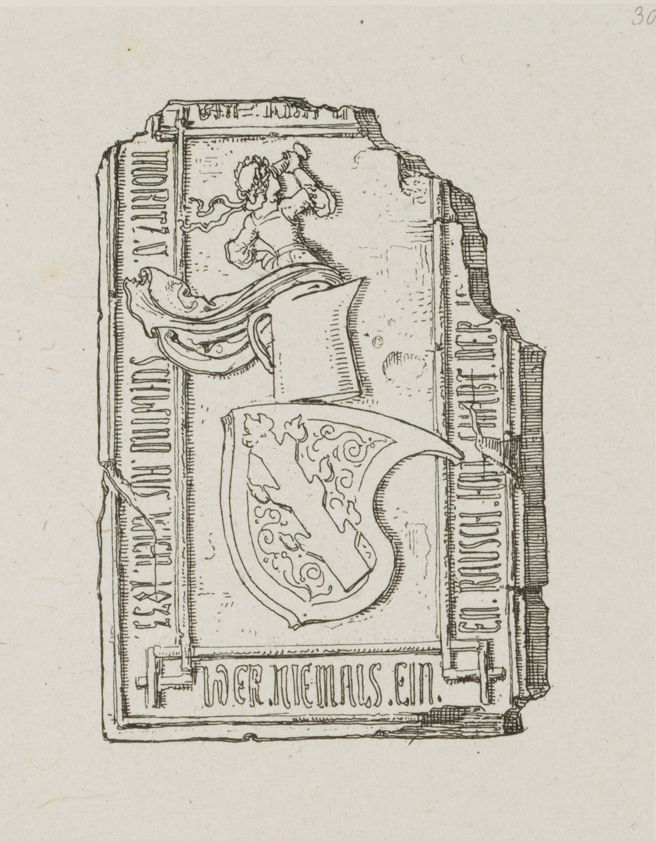 - Description: Numbered “30.” in the upper right above the depiction on the plate. Inscribed within the depiction around the gravestone “MORITZ. V. SWIND. FROM. VIENNA 1833. WHO. NEVER. ON. EN. RAUSH. HAS. HAVE. DER” On a grave slab, above a coat of arms with vine and tendrils, we see a helmet with a drinking man standing in it, crowned with laurel. The etching is from an album published in 1875 with 42 small-format etchings by Moritz von Schwind and poems/verses by Ernst Freiherr von Feuchtersleben on the subject of “smoking” and “drinking” (In vino veritas). The explanatory text for this depiction in the album reads: “When the hero is wallowing in paradise, his weary bones have long since slumbered, still leave the motto on the crumbling corpse stone: “He who fights and has feasted rejoices that he can rest; and he who has not had intoxication, this was not a good man”.