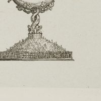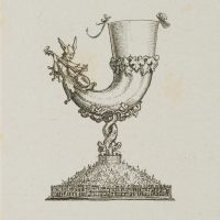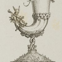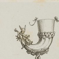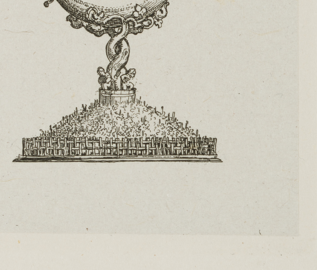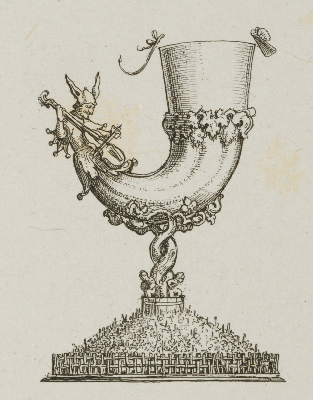 - Description: Numbered “31.” At the top of the drinking horn a donkey-eared NArr plays the cello. The foot is formed by an enclosed, overgrown hill, the stem winds from two vines below the horn. The etching is from an album published in 1875 with 42 small-format etchings by Moritz von Schwind and poems/verses by Ernst Freiherr von Feuchtersleben on the subject of “smoking” and “drinking” (In vino veritas). The explanatory text for this depiction in the album reads: “All that remains of the transfigured one’s entrails is this drinking horn: along with its glory, may it be dear to you, the grandchildren! Notice how the spirit of the ancestor still speaks to you from signs: Beware of bad pranks – a little foolishness does not hurt.