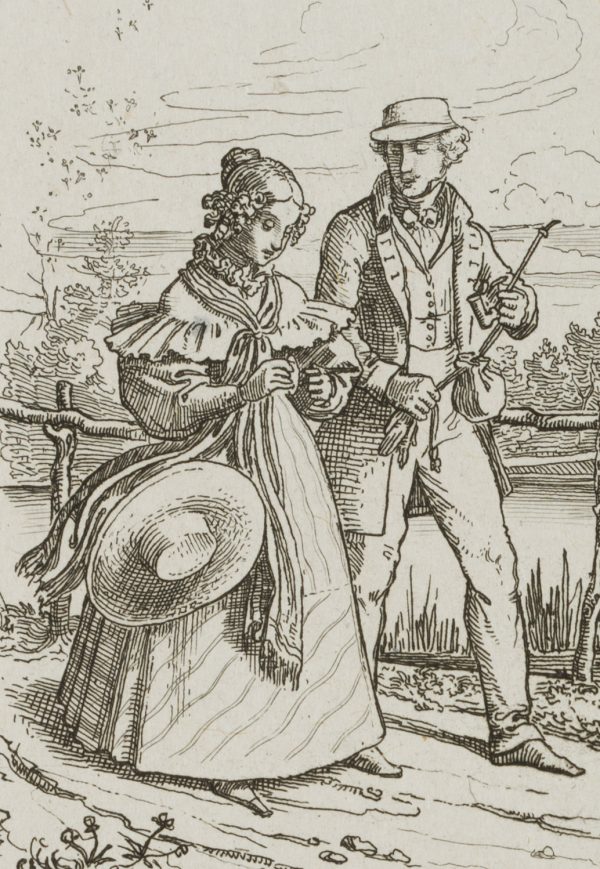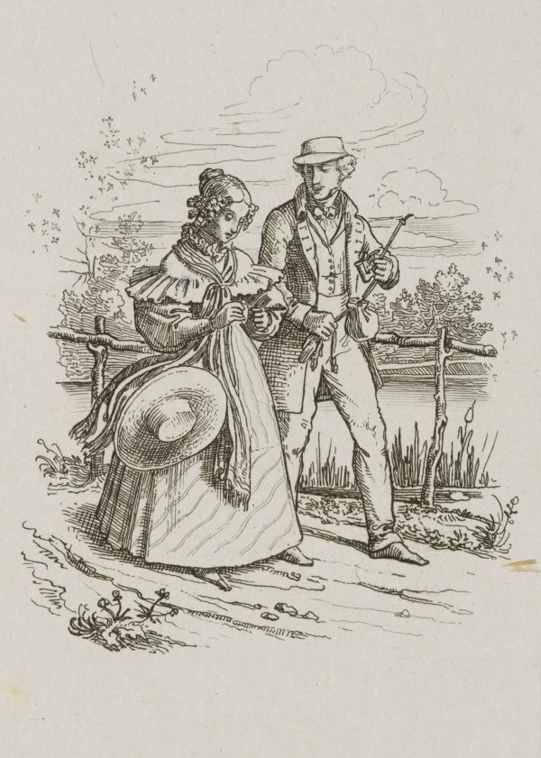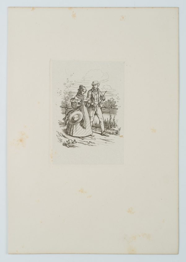- Description: Numbered “6.” in the upper right corner above the depiction on the plate. Small intimate scene of a couple taking a walk. While chatting, the lady is cleaning the pipe of her companion. The etching is from an album published in 1875 with 42 small-format etchings by Moritz von Schwind and poems/verses by Ernst Freiherr von Feuchtersleben on the subject of “smoking” and “drinking” (In vino veritas). The explanatory text for this depiction in the album reads: “My pipe to procure Mühest du dich, liebbes Kind? Soon the happy morning will appear when my toil for you begins! For marriage is a borrowing: women lend happiness to love, and the husband pays back the fruits of hard sorrows.”