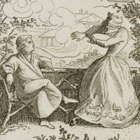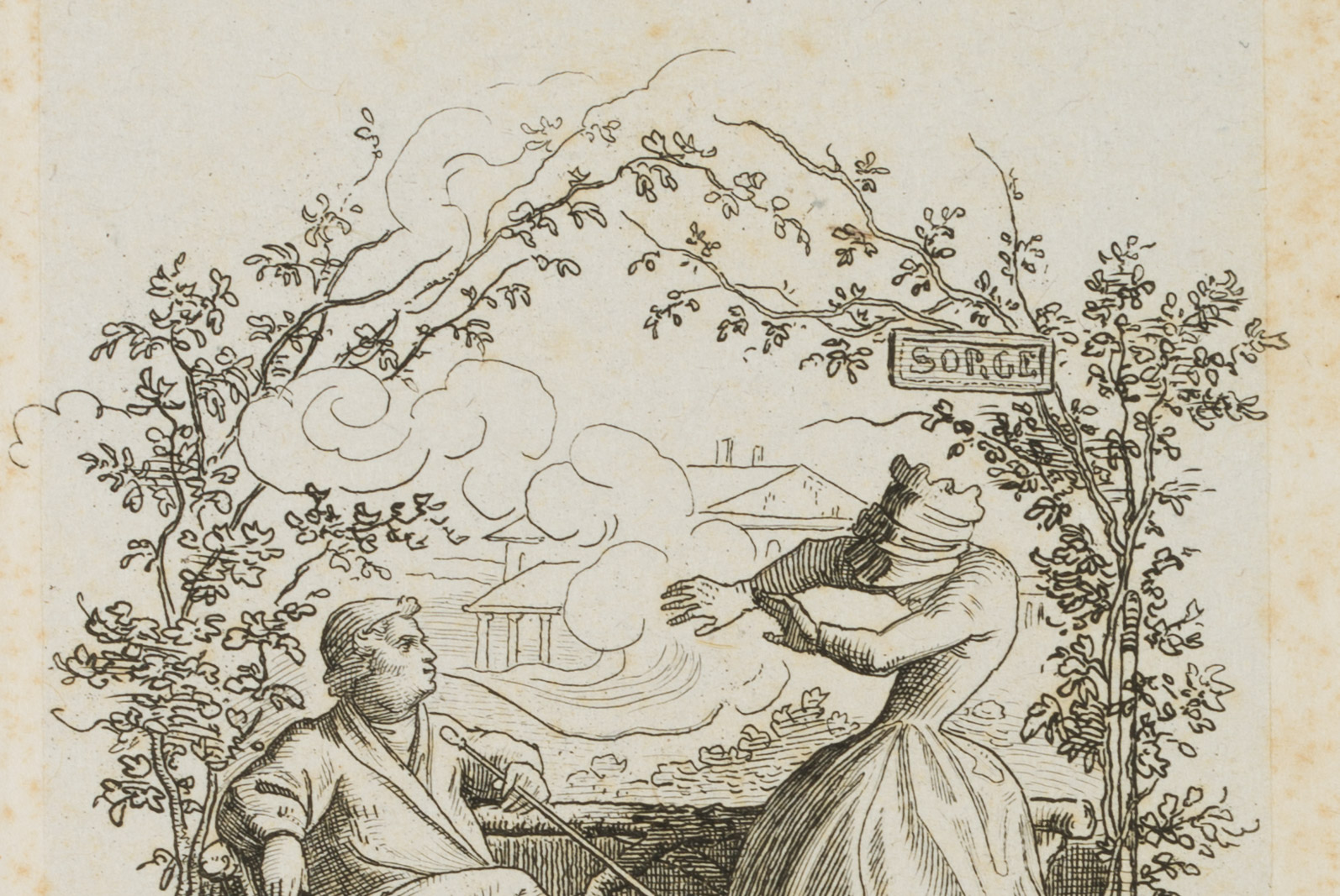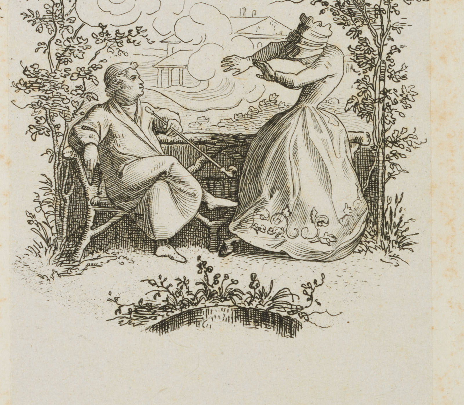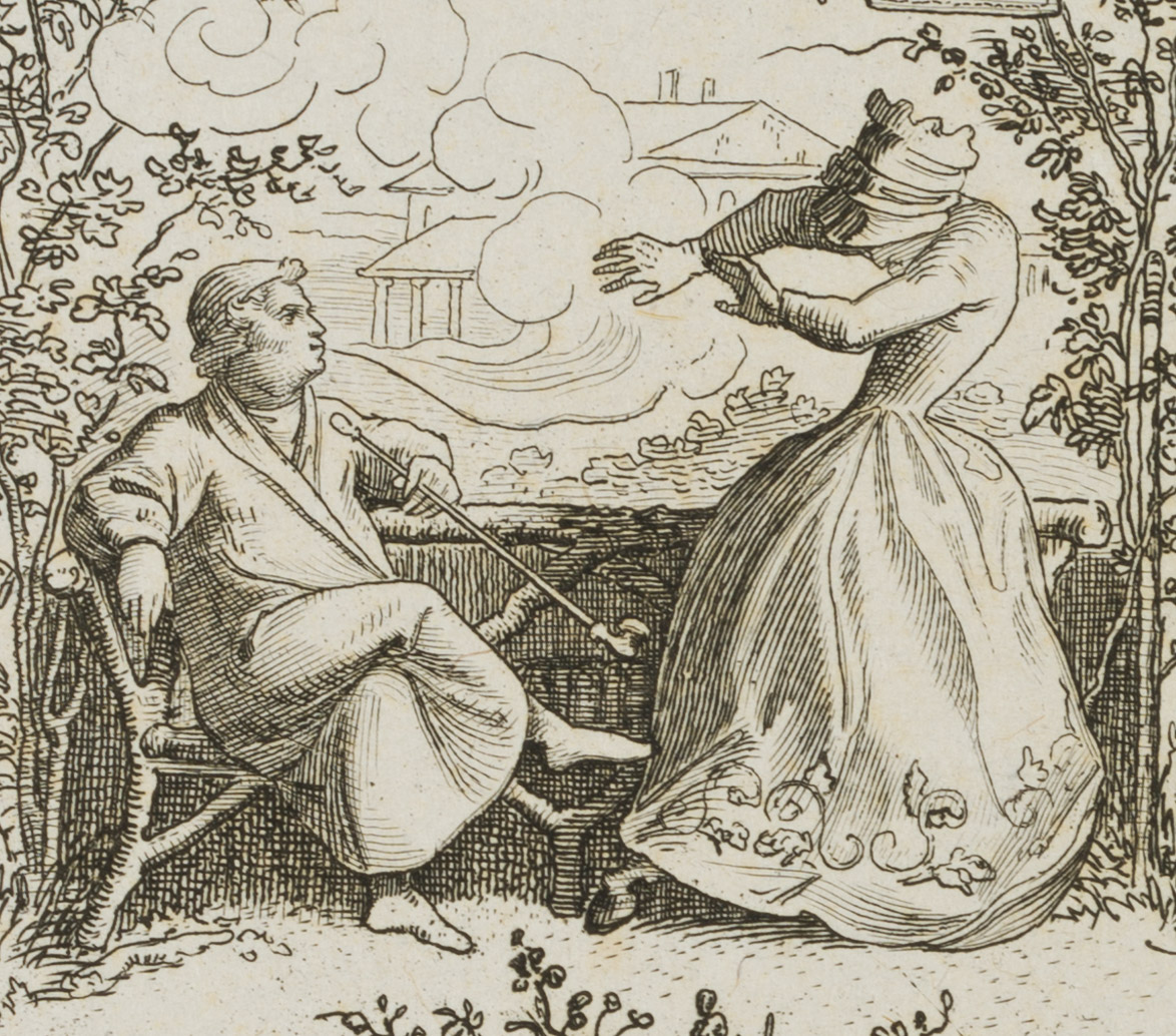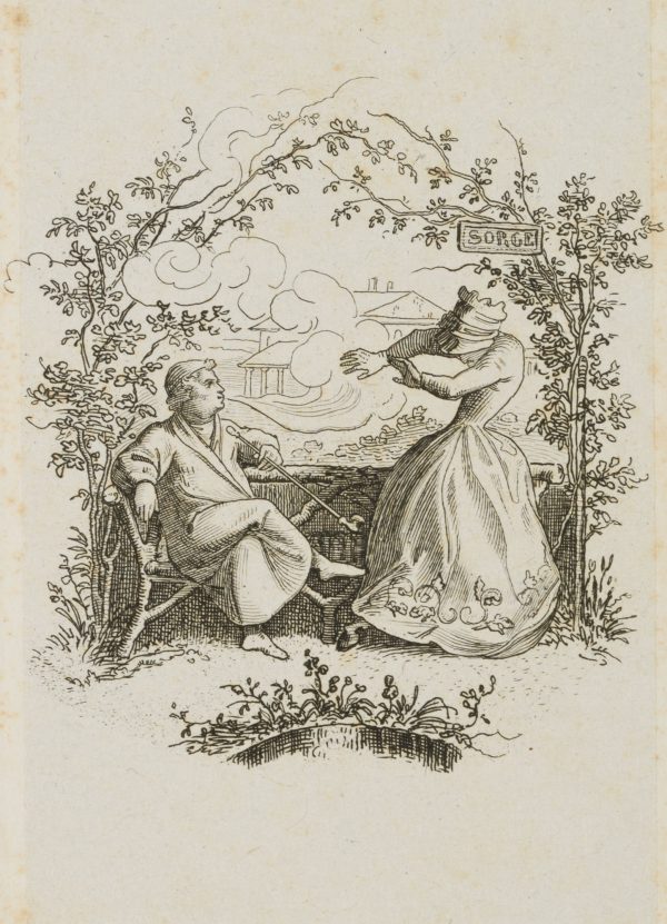 - Description: Numbered “1.” in the upper right corner above the depiction on the plate Delightful little scene with a sitting smoker and personification of ‘worry’ in the garden. The etching is from an album published in 1875 with 42 small-format etchings by Moritz von Schwind and poems/verses by Ernst Freiherr von Feuchtersleben on the subject of ‘smoking’ and ‘drinking’ (In vino veritas). The explanatory text for this depiction in the album reads: “Do you plunge into the fullness of life, but worry is close to you; do you flee into the garden’s silence? Look! It is already here again! If you want to chase it away thoroughly, go smoking to its body: it cannot stand smoking, for worry is a woman”.