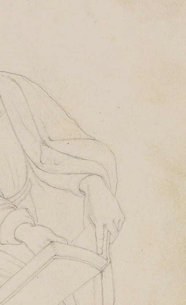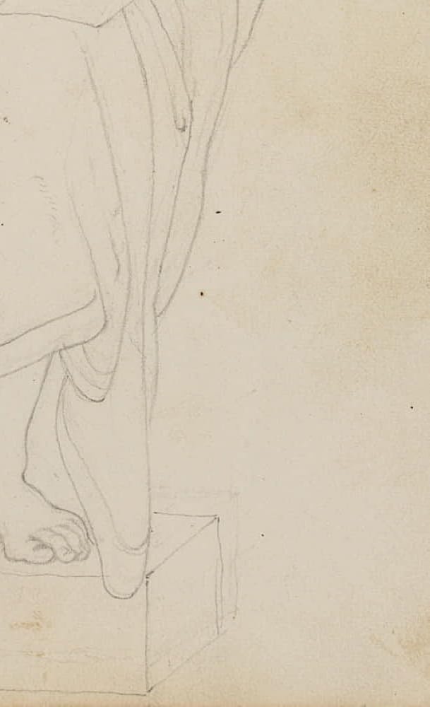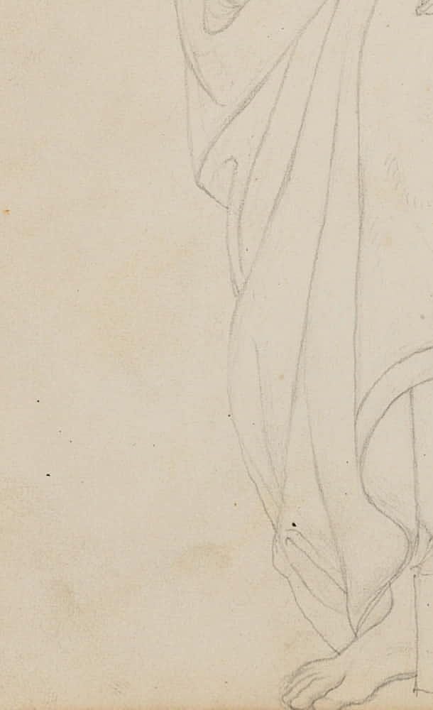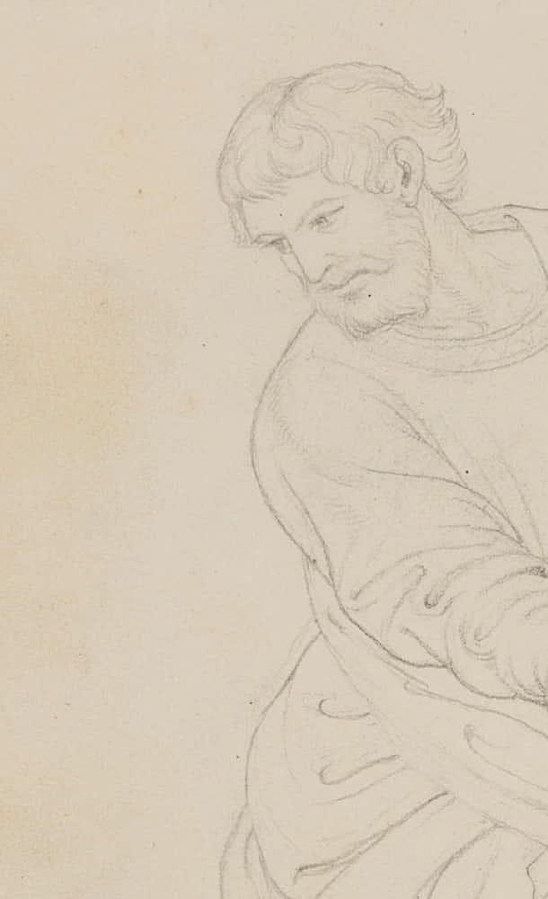 - Description: Sketch or figure and costume study for a history painting in the style of the German late Romanticism or the Nazarenes. Showing a standing figure in wrinkled antique garment, pointing with a firm gesture to an open book. On the reverse side there is a portrait study of an Italian-looking lady, sketched quickly and with few strokes. The sheet comes from a sketchbook by an anonymous artist from the circle of the famous history painter Moritz von Schwind (1804 Vienna – 1871 Niederpöcking), who is one of the most important painters of the German late Romantic period. As in Schwind’s works, the sketchbook contains numerous depictions of history scenes or illustrations of fairy tales and legends as well as religious themes.