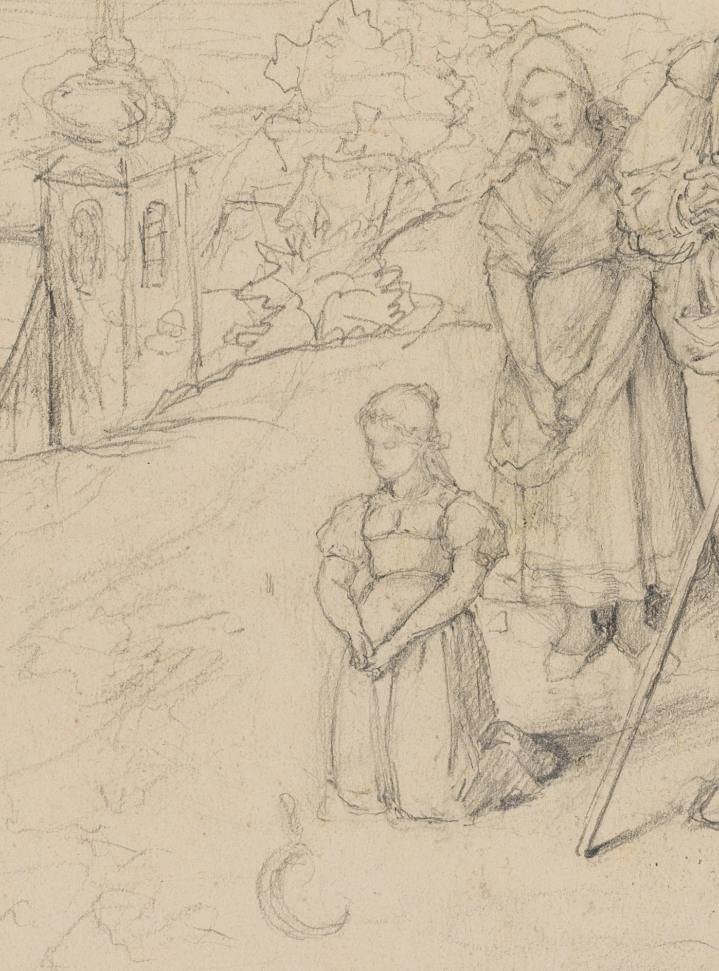 - Description: The sheet comes from a sketchbook by an anonymous artist from the circle of the famous history painter Moritz von Schwind (1804 Vienna – 1871 Niederpöcking), who is one of the most important painters of the German late Romantic period. As in Schwind’s works, the sketchbook contains numerous depictions of history scenes or illustrations of fairy tales and legends as well as religious themes.