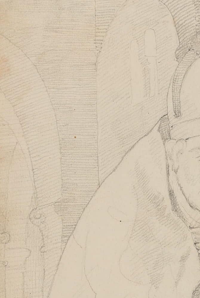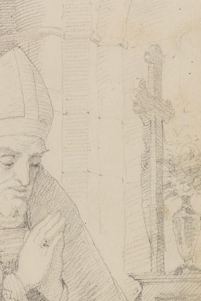 - Description: Sketch drawn with fine hatching and shading or a figure and costume study for a history painting in the style of the German late Romanticism or the Nazarenes. Showing the bishop Alfonso Maria de’ Liguori kneeling at the altar in a church, who was canonised and raised to the rank of Doctor of the Church. The sheet comes from a sketchbook by an anonymous artist from the circle of the famous history painter Moritz von Schwind (1804 Vienna – 1871 Niederpöcking), who is one of the most important painters of the German late Romantic period. As in Schwind’s works, the sketchbook contains numerous depictions of history scenes or illustrations of fairy tales and legends as well as religious themes.
